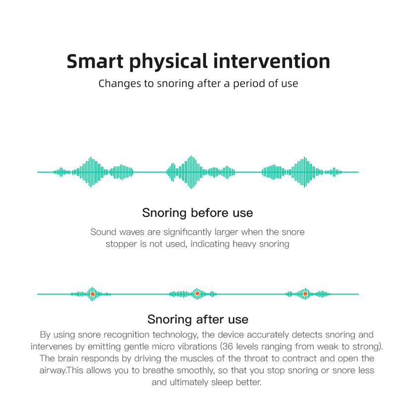 When the snoring sound is recognized as snoring by the device, the device will vibrate and the vibration level will be adaptive. If the intervention of the current vibration level is unsuccessful, the vibration will increase step by step, reaching the highest level of snoring intensity set by the user. If the intervention is successful, the vibration level will be maintained; if there is no snoring for a long time, the vibration level will be reduced.