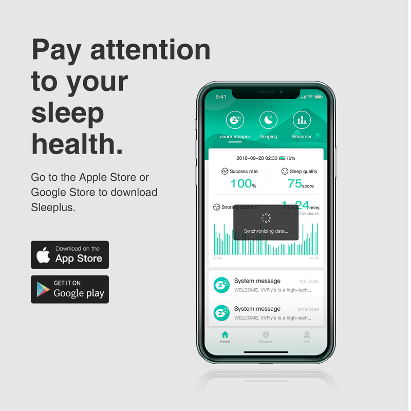 After syncing your device data with the app, you can view your sleep data, snore data, and intervention data, and you can customize the intensity of vibration and snore sensitivity of the snore stopper.