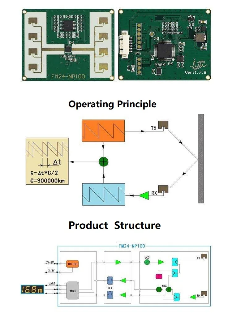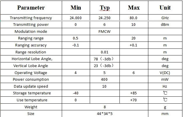 FM24-NP100 is a K-band millimeter-wave ranging radar with antenna isolation design. It works by measuring the time difference between the transmitted and received signals to measure the distance of the object. Its work is frequency modulation continuous wave mode (FMCW) . FM24-NP100 integrates all the signal processing units of the microwave radar, users only need to get the distance of the object through a serial interface, for multi-target recognition or other users who need to measure the environment, the range spectrum information can be obtained by changing its working mode for further processing. For customers with special needs can be customized to meet their own requirements.