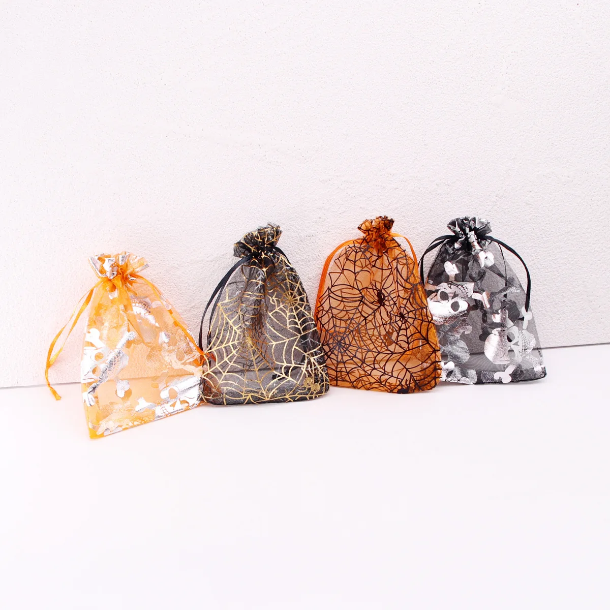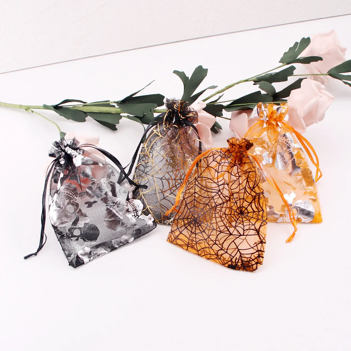 25/50/100pcs Colorful Halloween Organza Gift Bags Skull Spider Web Printing Packaging Gift High Quality Drawstring Candy Bag