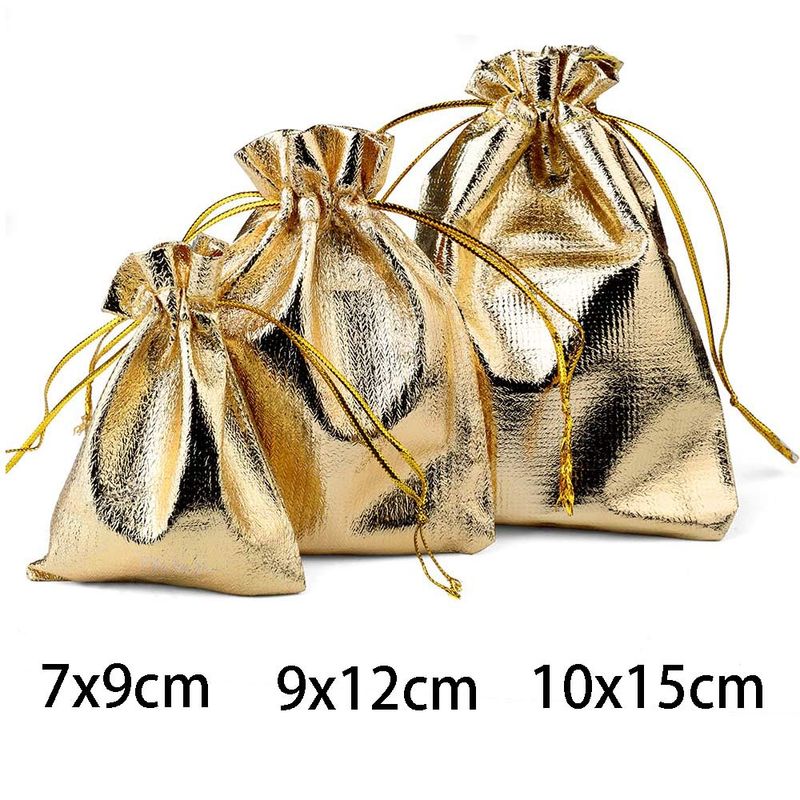 Name:25pcs 7x9/9x12/10x15cm Fabric Packing Gift Bags Gold Color Jewelry Packaging Bag Wedding Party Present Drawstring Pouch