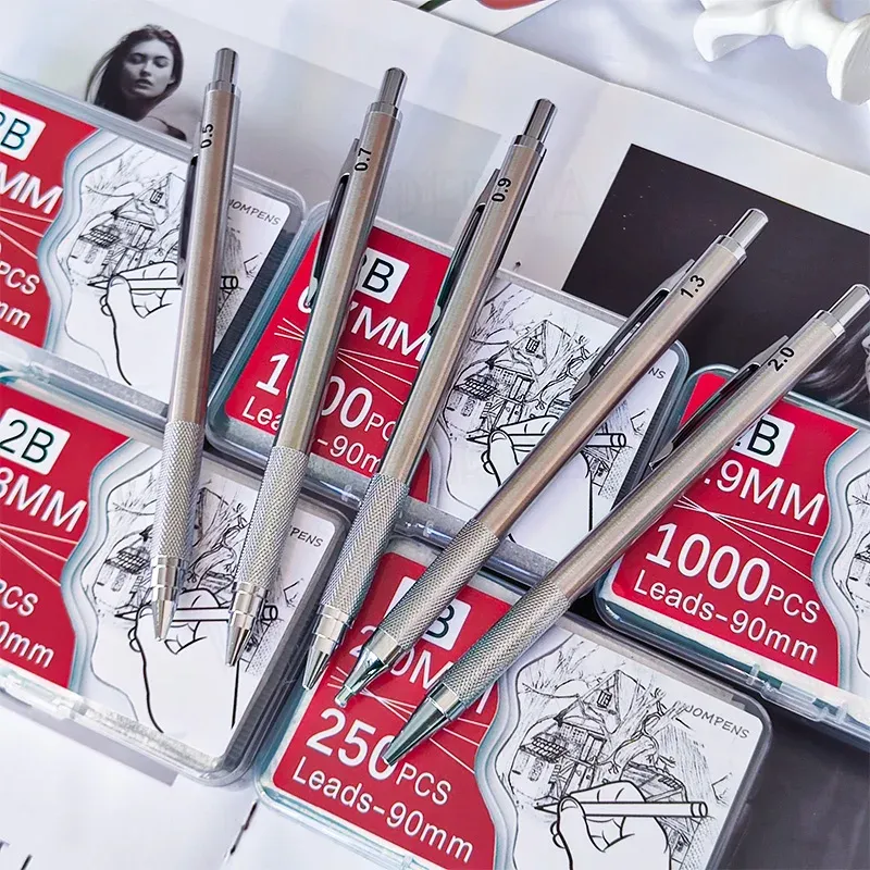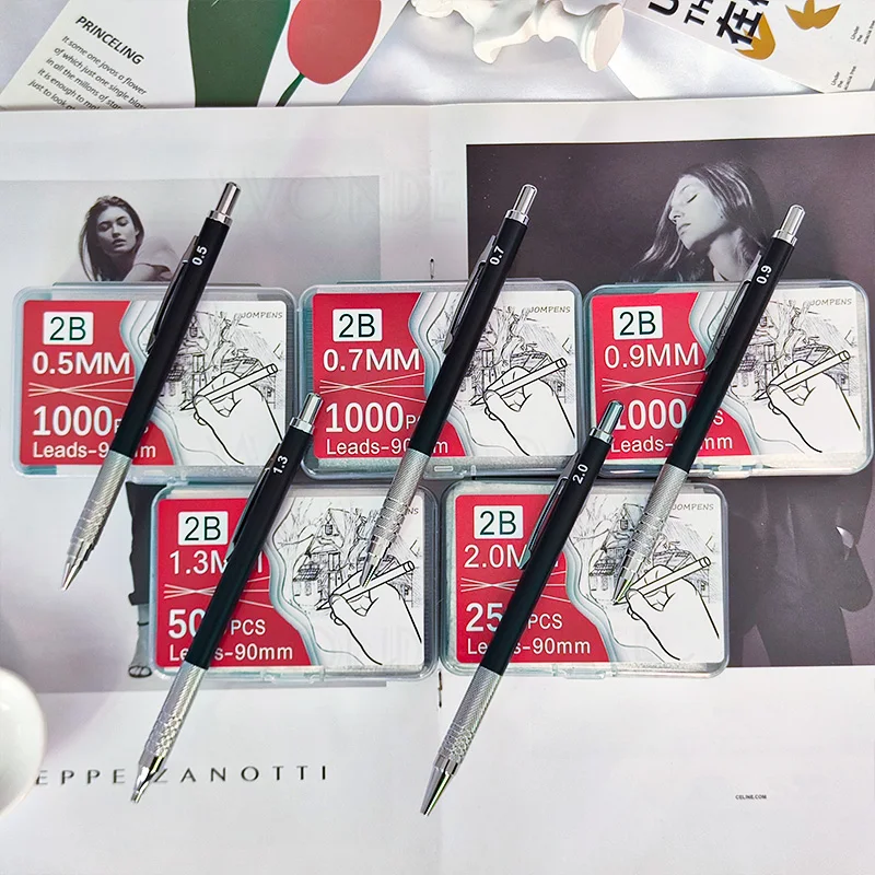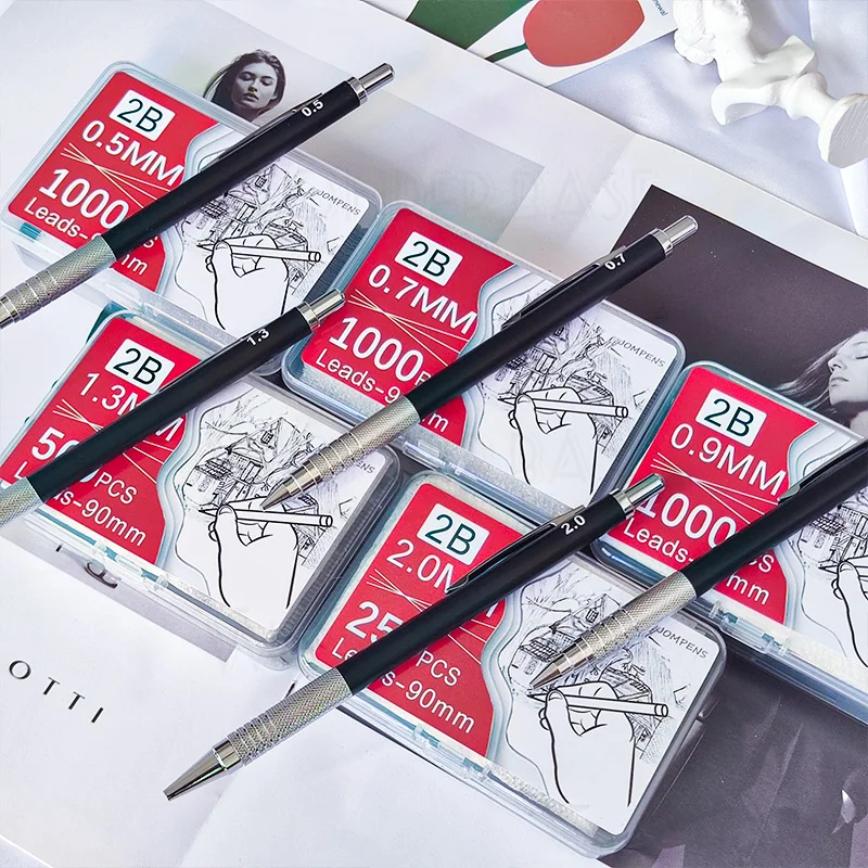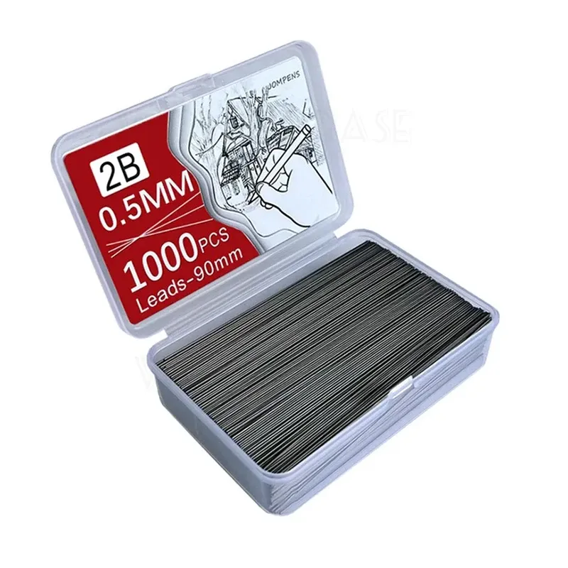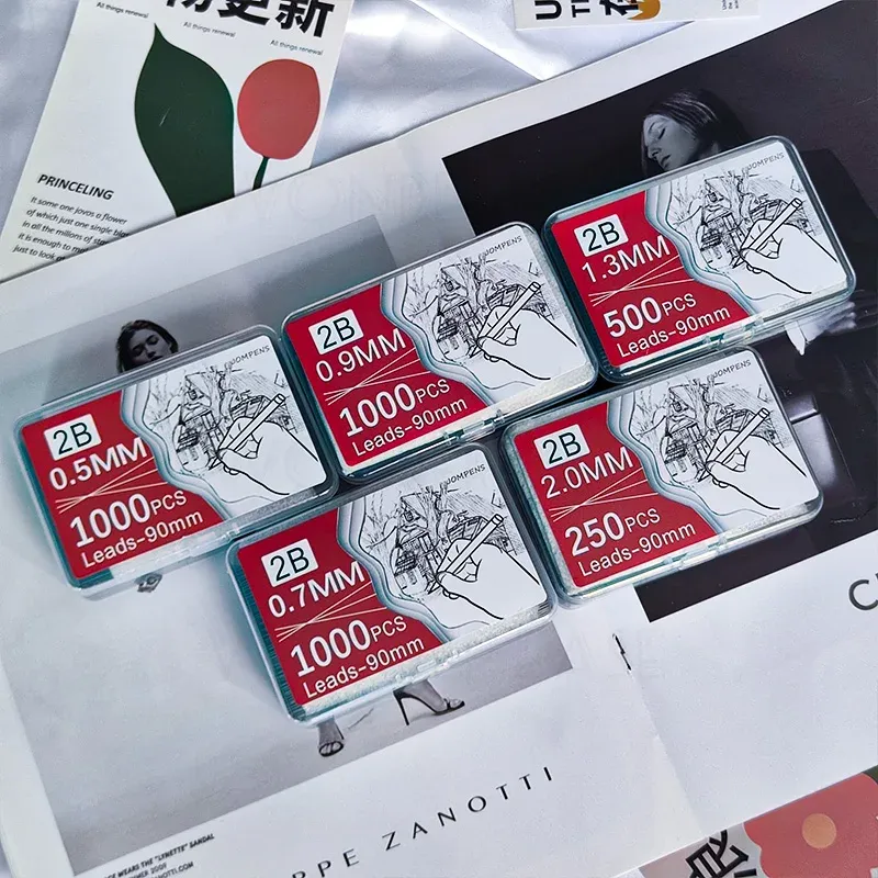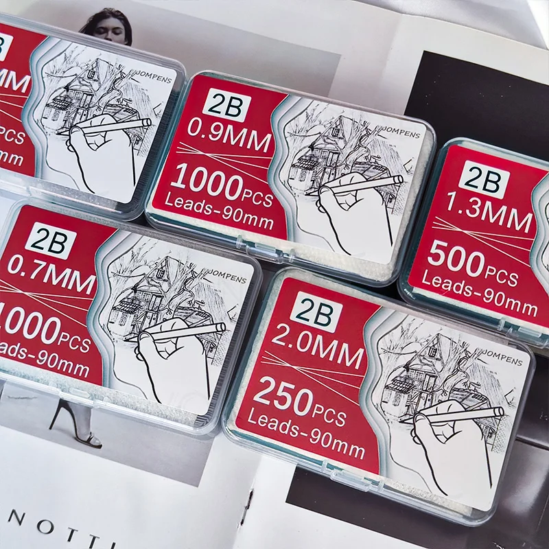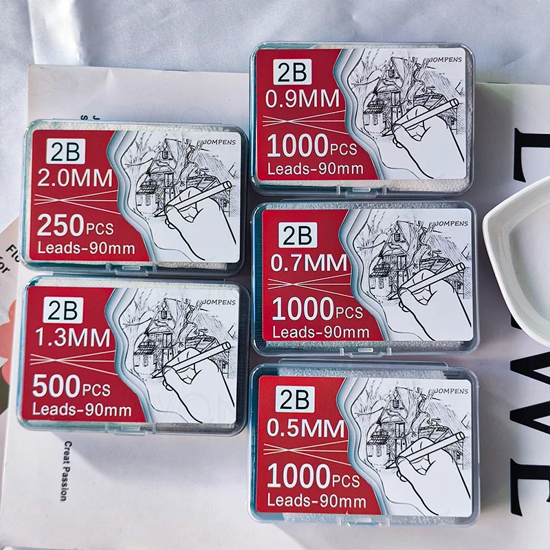 1. Multiple sizes: Large capacity boxed 2B automatic pencil lead with dimensions of 0.5/0.7/0.9/1.3/2.0mm, all with a length of 90mm.