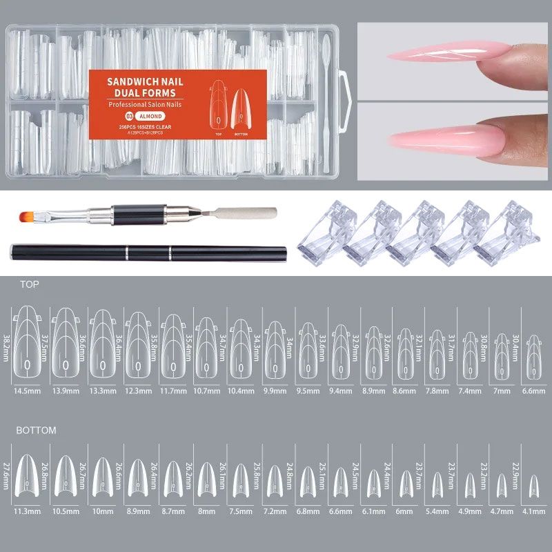 256pcs Sandwich Dual Nail Mode For Nail Extension Almond Coffin 16Size Reusable Top Bottom Forms Nail Art Extension Tools