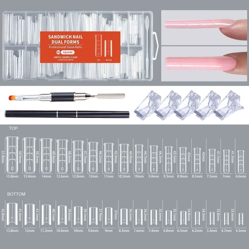 256pcs Sandwich Dual Nail Mode For Nail Extension Almond Coffin 16Size Reusable Top Bottom Forms Nail Art Extension Tools