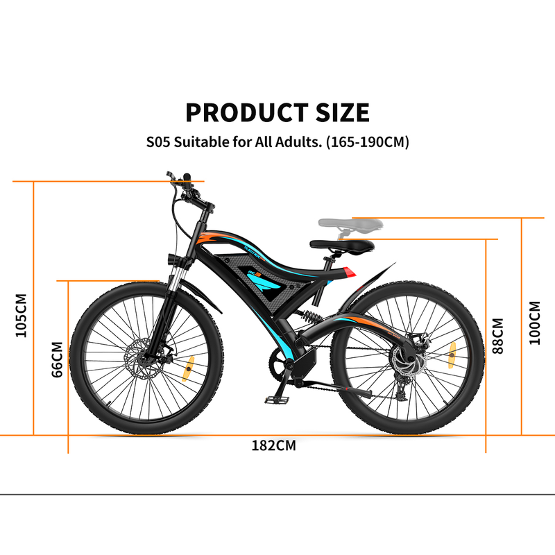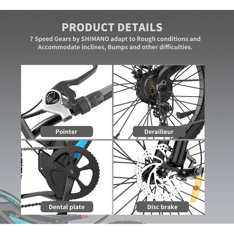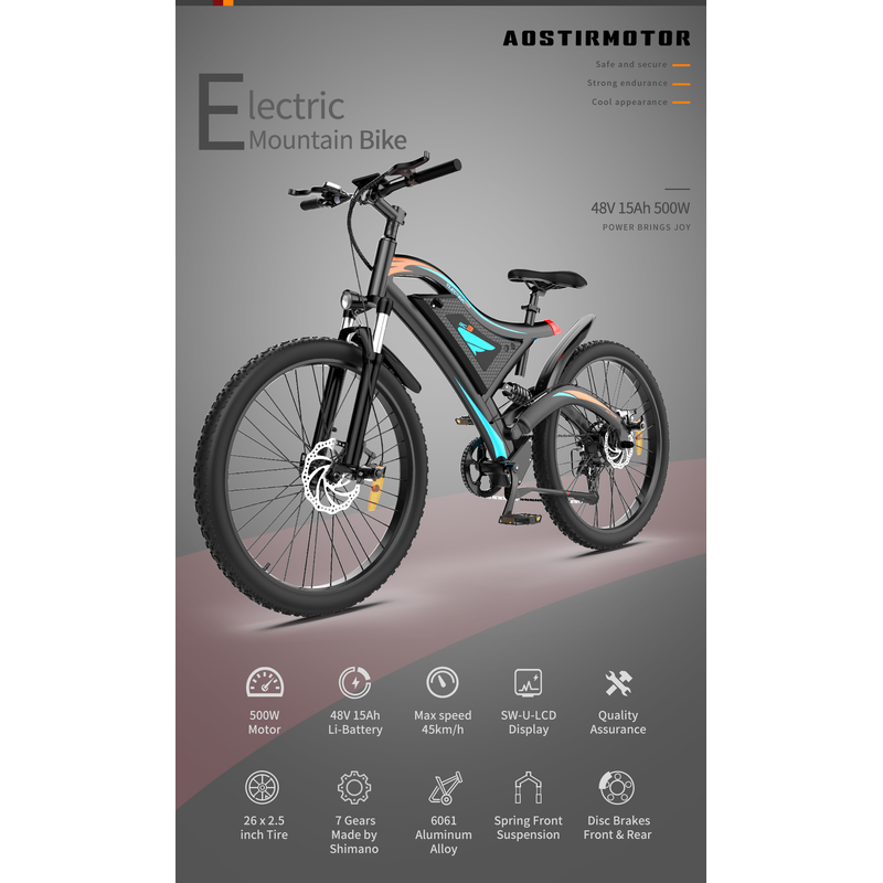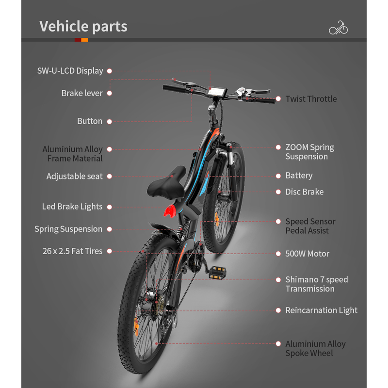 Our 500W electric bikes are equipped with headlight, dual mechanical disc brakes, 7-speed finger shifter & derailleur, shock-absorbing front fork,rear spring shock absorber