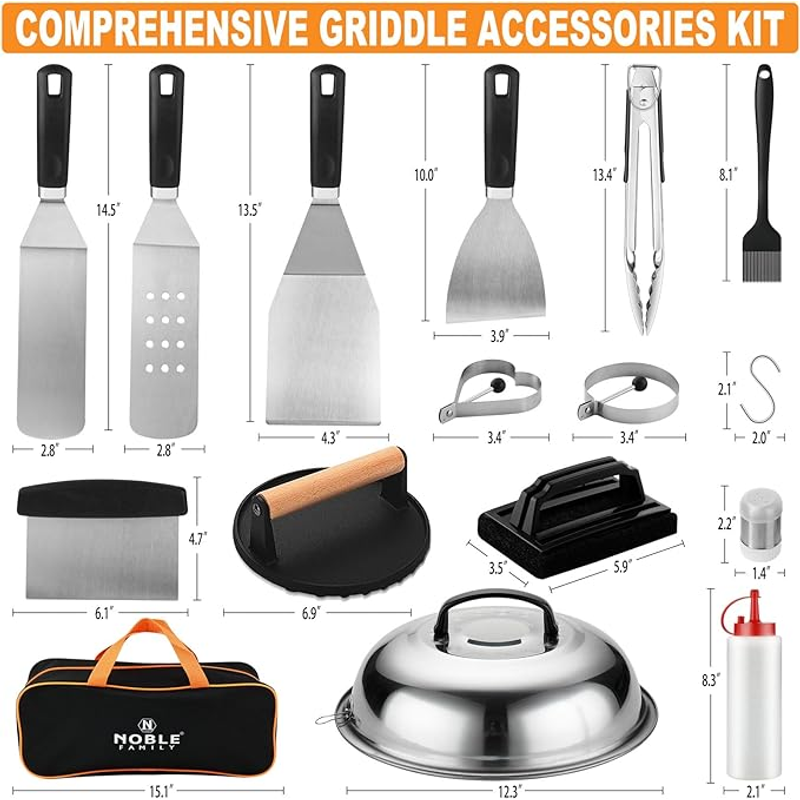 Perfect 27Pcs Griddle Accessories set : Our griddle kit includes 1 long griddle spatula, 1 slotted spatula, 1 extra wide griddle spatula, 1 slant edge scraper, 1 grill chopper, 1 BBQ tongs, 1 round burger press, 1 basting brush, 2 egg rings, 2 pepper & salt shakers, 2 squeeze bottles, 10 hanging hooks, 1 basting cover, 1 cleaning brush, 1 carry bag with a gift box.