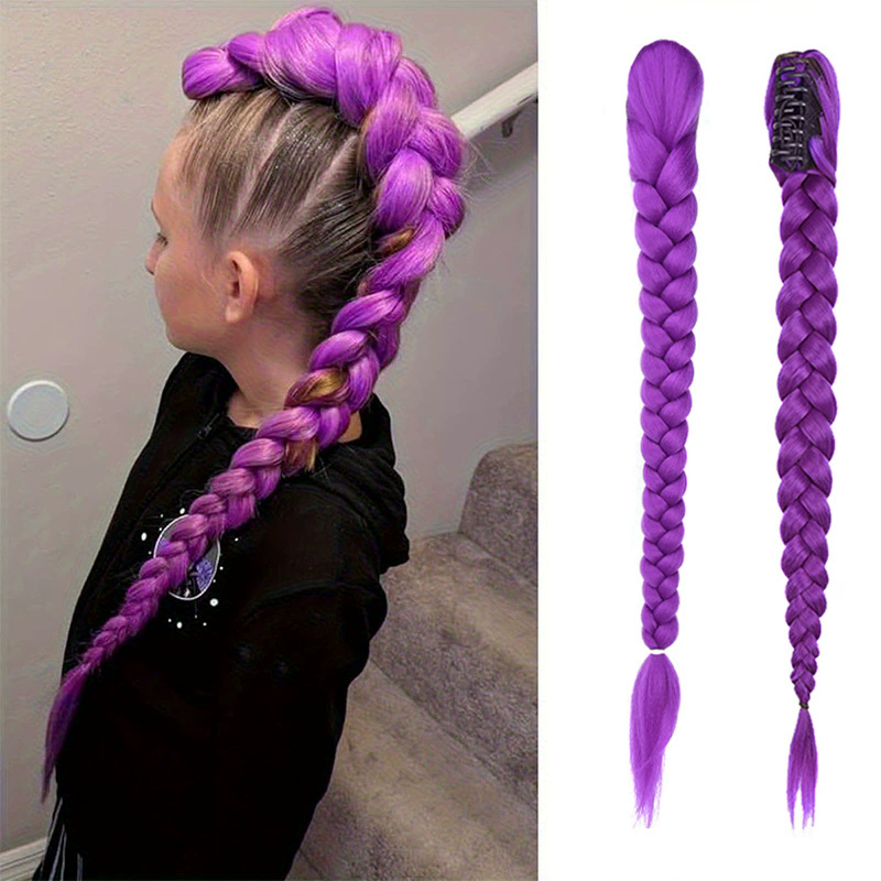 28inch Synthetic Long Braided Purple Hair Ponytail Extensions Claw Clip Hair Wig for Kids Costume for Chritmas Theme Party Wig