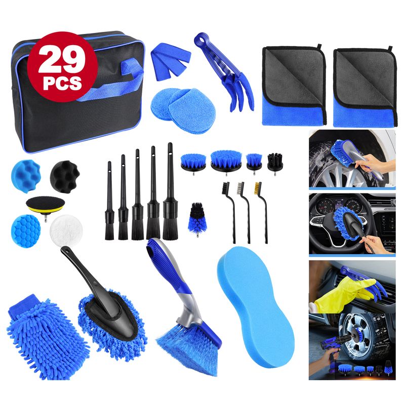 🚗29PCS car detailing kit: Detailing Brushes*5,Drill Brush Set*5,Wire Brushes*3,Drill Polishing Sponge Pad*3,Car Washing Towel*2 ,Air Conditioner Outlet Brush*2,Wax Applicator*2,Imitation Wool Pad*1,Car Wash Mitt*1,Car Wash Sponge*1,Suction Cup*1,Durable Storage Bag*1,Dust Brush*1,Tire Brush*1. The car detailing kit is complete with tools that can basically meet all your car washing needs.