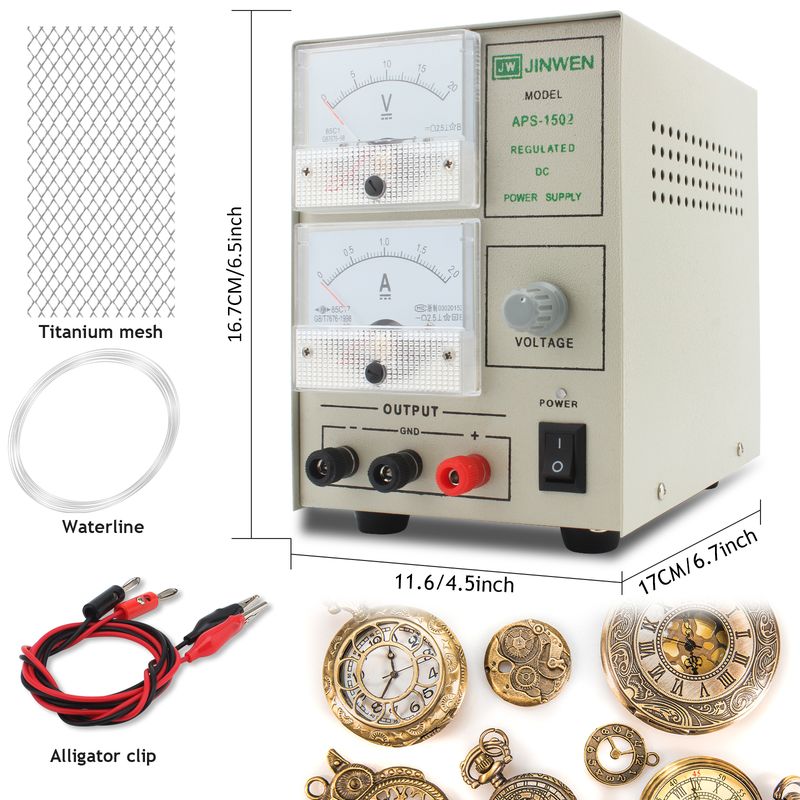 【Technical Parameter】Positive (+): Titanium mesh negative (-): Jewelry,Maximum adjustable voltage: 20V,Maximum adjustable current: 2.0A,Temperature: 30-40.C,Gold plating time: 90-120 seconds,(Note)Electroplating items need to be shaken at the beginning.