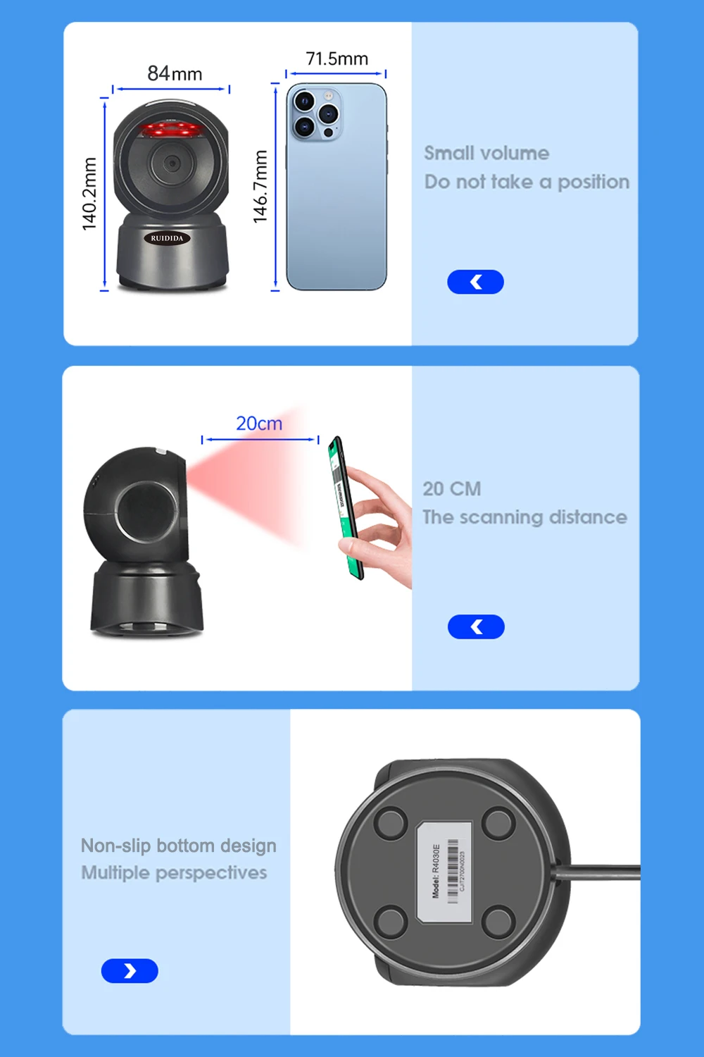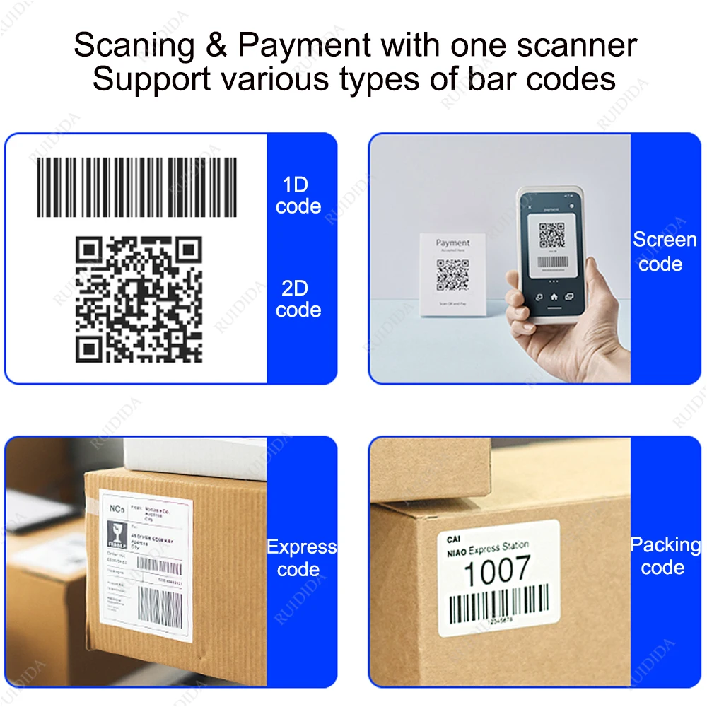 4. Excellent performance, quickly identify 1D/2D code, Paper code, Screen code, Plastic code, and irregular code, such as reflective code, colorful code, distorted code, fuzzy code, damaged code,misplaced code.