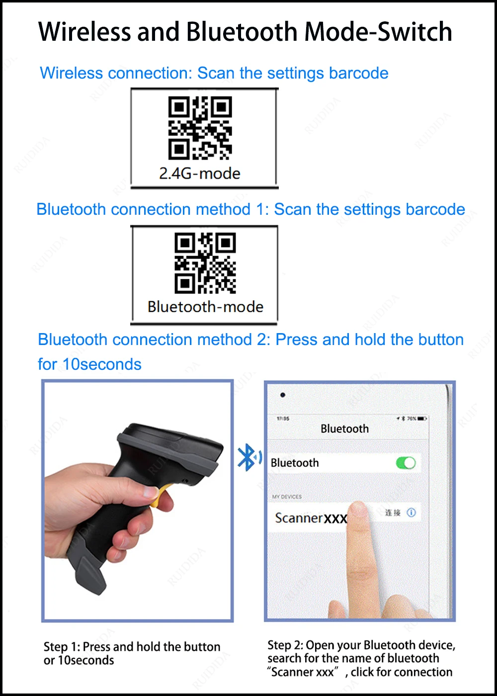 3. Wireless/Bluetooth has 2000mAh Large capacity battery, long time scanning.