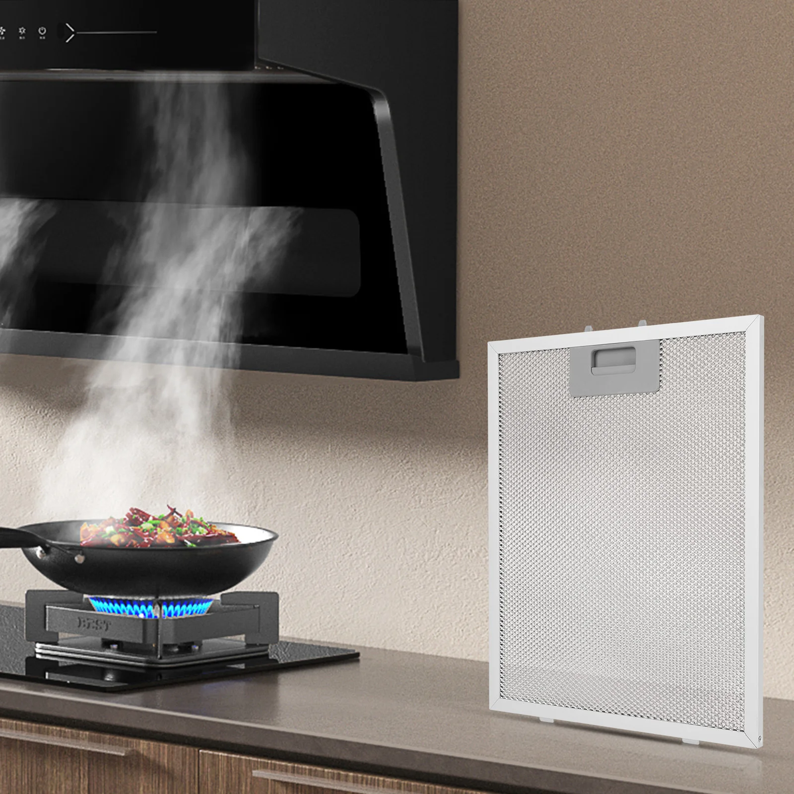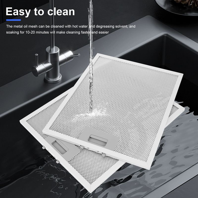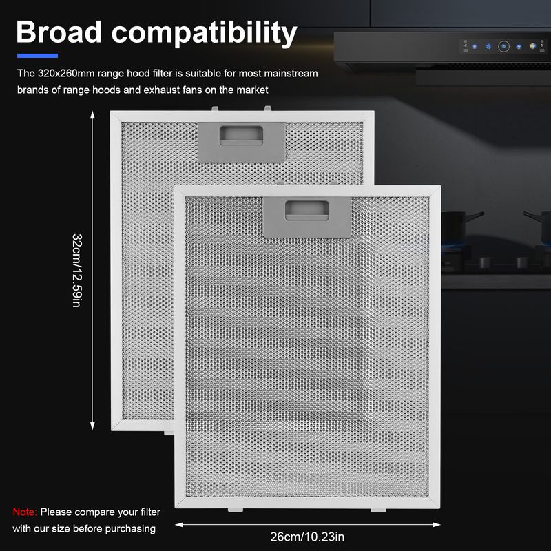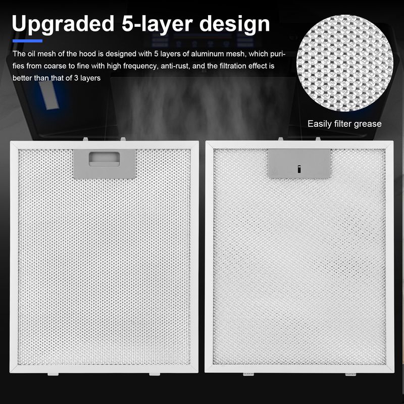 Features: 1.Wide Compatibility: The 320x260mm range hood filter is suitable for most mainstream brands of kitchen hoods and exhaust fans in the market. Please compare your filter with our dimensions before purchasing. 2.Upgraded 5-Layer Design: Featuring a cooker hood filter with 5-layer aluminum mesh design, it provides high-frequency purification from coarse to fine, rust-proof, and better filtration than 3-layer filters, easily filtering kitchen grease. The thickened aluminum frame ensures the filter is sturdy and less prone to deformation. 3.Quick Installation: No tools needed, this metal mesh extractor vent filter can be installed easily in just a few minutes. The aluminum grease filter includes a convenient handle for easy removal and installation. 4.Easy to Clean: The metal mesh hood grease filter can be cleaned with hot water and degreasing solvent. Soaking for 10-20 minutes will make cleaning faster and easier. Regular maintenance keeps your range hood performing optimally and your kitchen air fresh. 5.Sturdy Materials: High-quality materials ensure long-lasting performance and reliability, providing efficient kitchens hoods oil filter for maintaining a clean and healthy cooking environment. Specification: Origin: Mainland China Size: 320.00x260.00x9.00mm/12.60x10.24x0.35inch Metal type: Aluminum