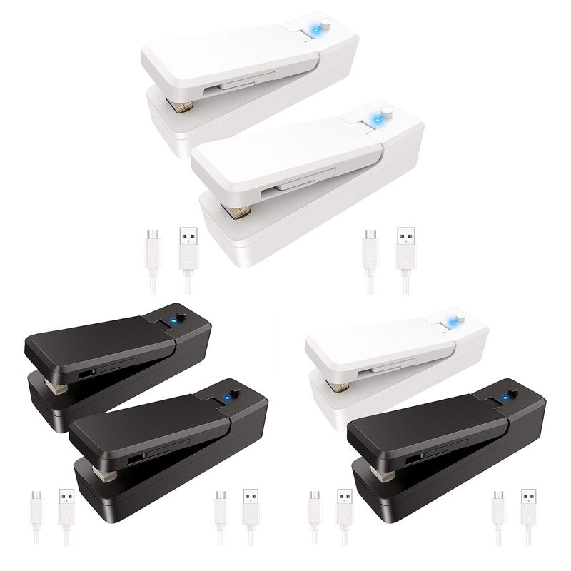 Feature: 1. 2 in 1 Heat Sealer & Cutter: Portable mini sealer can easily cut and seal plastic bags. Quick seal and cut. 2. & Keep Healthy: The sealer is a good choice to keep it fresh, you can use the sealer to seal the bag for future consumption. It's a dieting accessory. No need to buy fresh bags anymore, reseal unused portions of food, keep food in the fresh bag sealer heat sealer. 3. How to Use: Make sure the product is fully charged, then press the switch button to display blue. Press and hold for about 3-7 seconds to start heating. 4. Built-in 400mAh Battery: The sealing machine has a built-in rechargeable lithium battery with a capacity of 400mAh, and is equipped with a Micro USB charging cable, which can be charged through a computer, mobile phone, rechargeable battery, and charging head. 5. Application: The sealing machine is very suitable for snack bags, aluminum foil bags, potato chip bags, kraft paper bags, pet food bags, vacuum packaging bags, etc. Specification: Vacuum Food Sealers: Heat Sealing Machine Vacuum Packing Machine: Snack Bags Vacuum Sealer Type: Hand Held Model Number: Vacuum Food Sealers Name: Charging Sealing Machine Material: ABS+stainless steel+ceramic Product size: About 3.5x2.6x11.00CM/1.37x1.02x4.33in Package size: About 4.2x8.4x14.6CM/1.65x3.3x5.74in Weight: 180g Battery capacity: 400mAh polymer lithium battery Color (optional): White, Black, White + Black