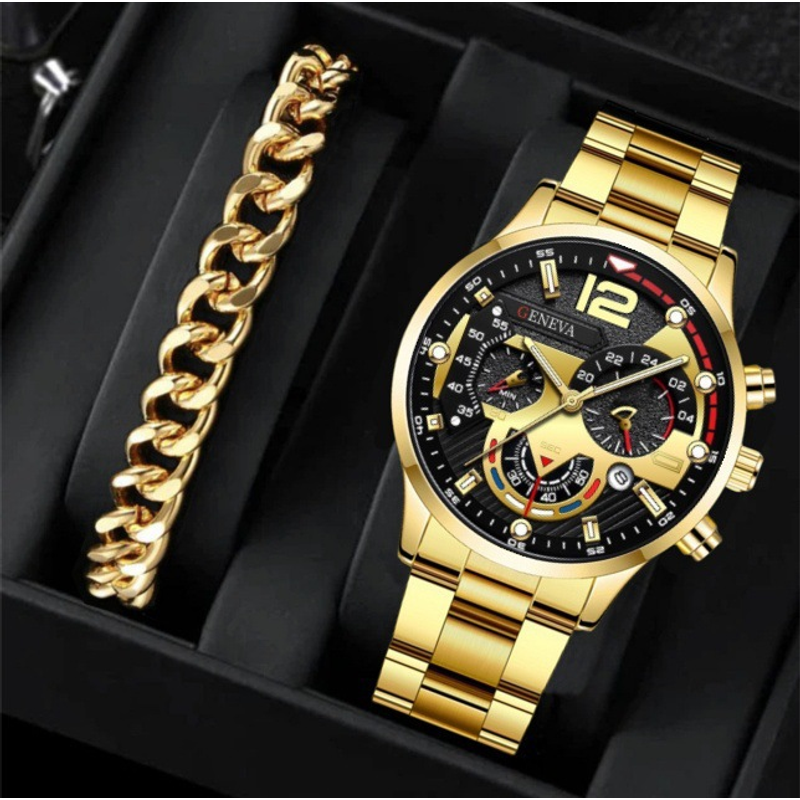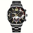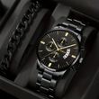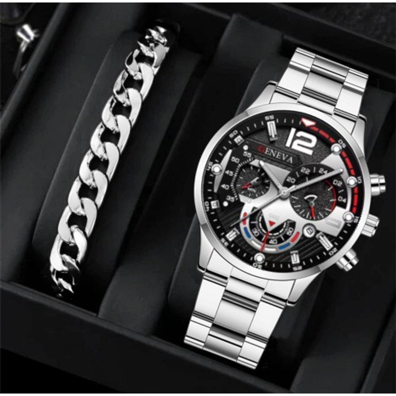 2pcs Men's New Popular Steel Strip Fashion Business Three Eye Quartz Watch Bracelet Set Valentine's Day Gifts Silver Black Bracelet