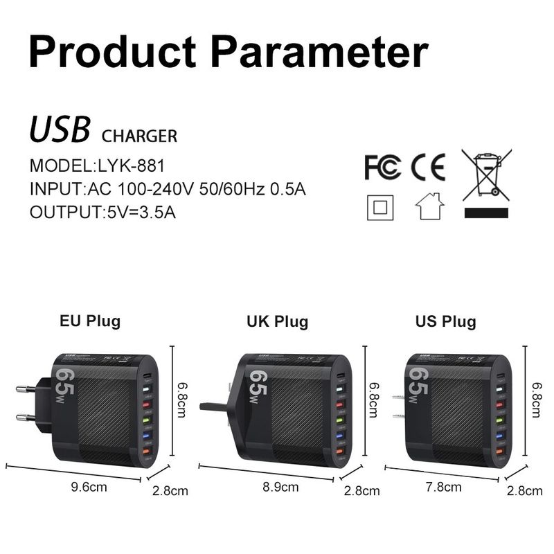 Total: Power output: [all 5 * USB-A + 1 USB-C]= 65W total;