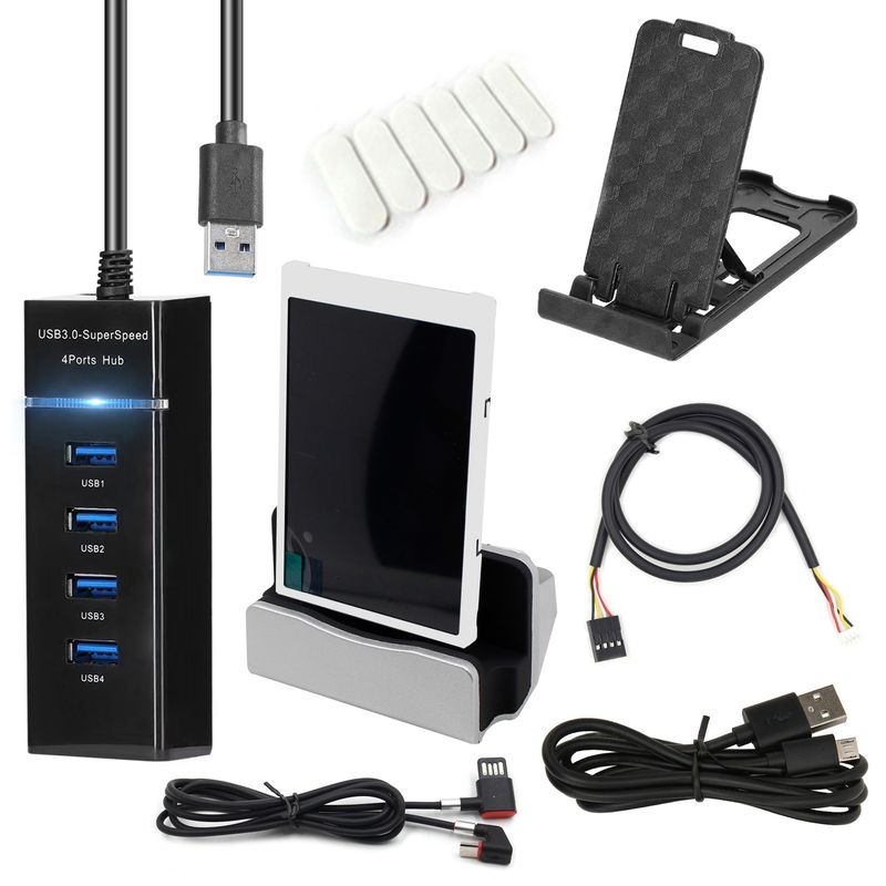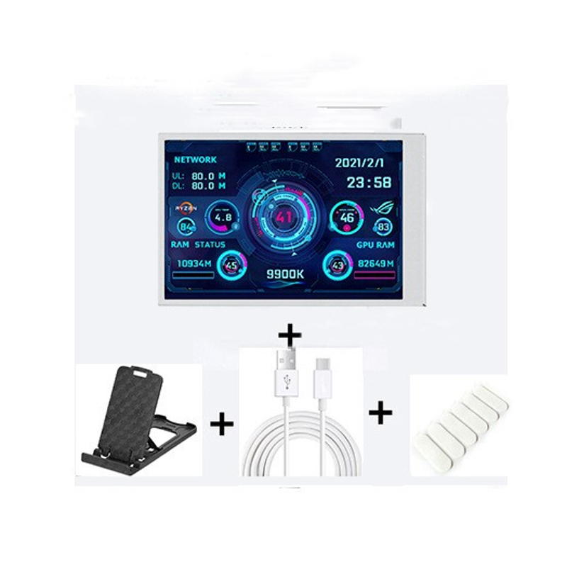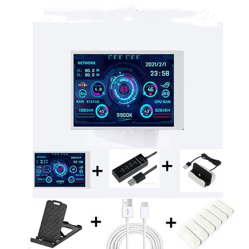 Package 3: Screen +Type-C data cable + stand +usb four-port spliter +Type-C charging base + Elbow data cable type-c+4PIN motherboard transfer cable 9 pins