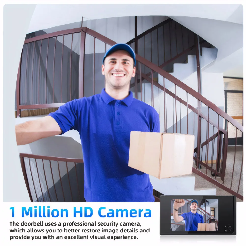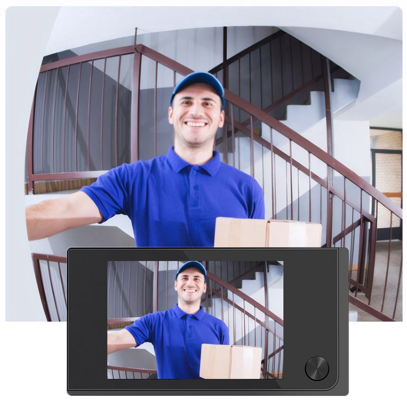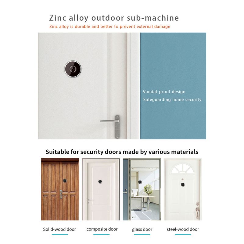 Feature: 1. Invisible Camera: The peephole door video camera features an invisible camera designed to look like a traditional peephole. With one-click viewing and no need for storage, it ensures your privacy is protected. 2. Stylish Design: The digital doorbell viewer boasts a stylish and classic design with simple features that align with Western aesthetics, making it a addition to any modern home. 3. 120° Wide-Angle Lens: Equipped with a 120° wide-angle lens, the wireless video doorbell provides a clear view of the details outside your door, reducing potential security risks. 4. Zinc Alloy Outdoor Unit: The peephole viewer is made from zinc alloy material, offering maximum protection against vandalism and ensuring durability. 5. Megapixel Camera: The cat eye door bell uses a professional-grade security camera, allowing you to capture detailed images and providing an excellent visual experience. Specification: Origin: Mainland China Display: 3.5-inch LCD screen, resolution 480*320 Image sensor: 1 million pixels Viewing angle: 120° Power supply: 4 No. 7 batteries (4*AAA) not included Applicable door hole range: 14-28mm Applicable door thickness range: 40-100mm Product size: Indoor unit: 118*62*19mm/4.65x2.44x0.75inch Outdoor: 32*32*6mm Packaging size: 147*137*47mm Gross weight: 200g