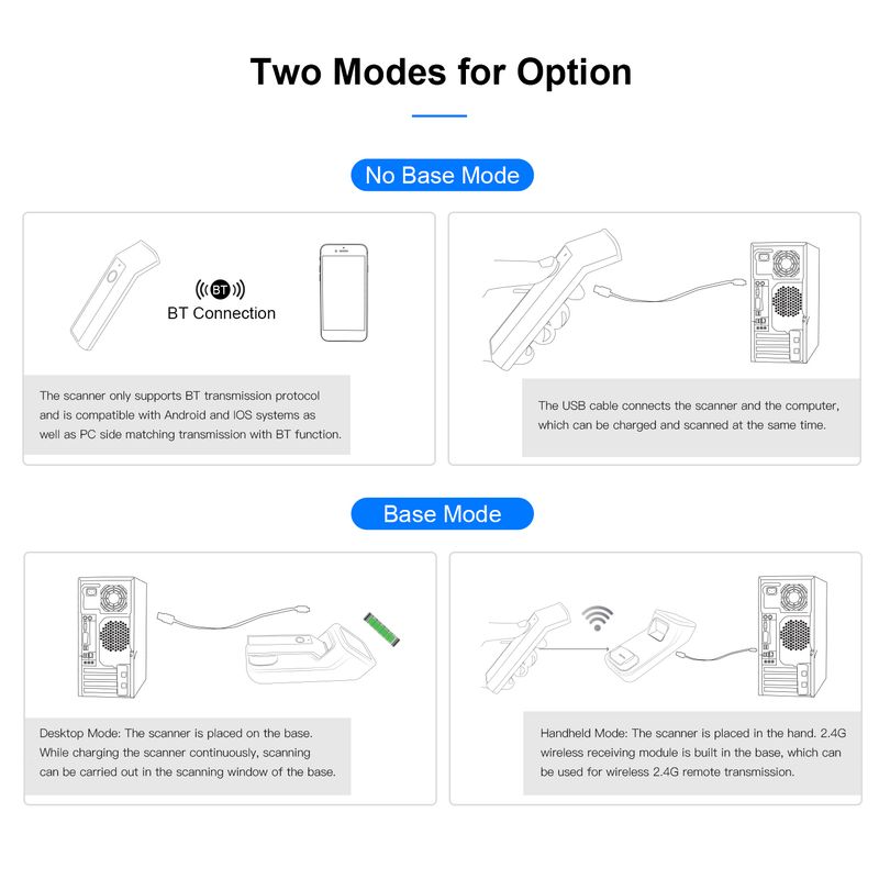 Come with an multi-functional base, which can be used as a barcode scanner or charging station, easy to operate and convenient to use.