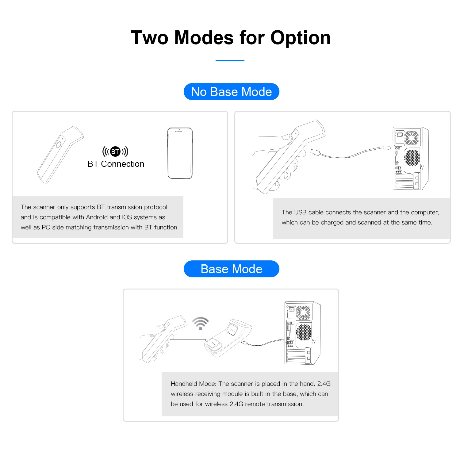 Come with an multi-functional base, which can be used as a barcode scanner or charging station, easy to operate and convenient to use.