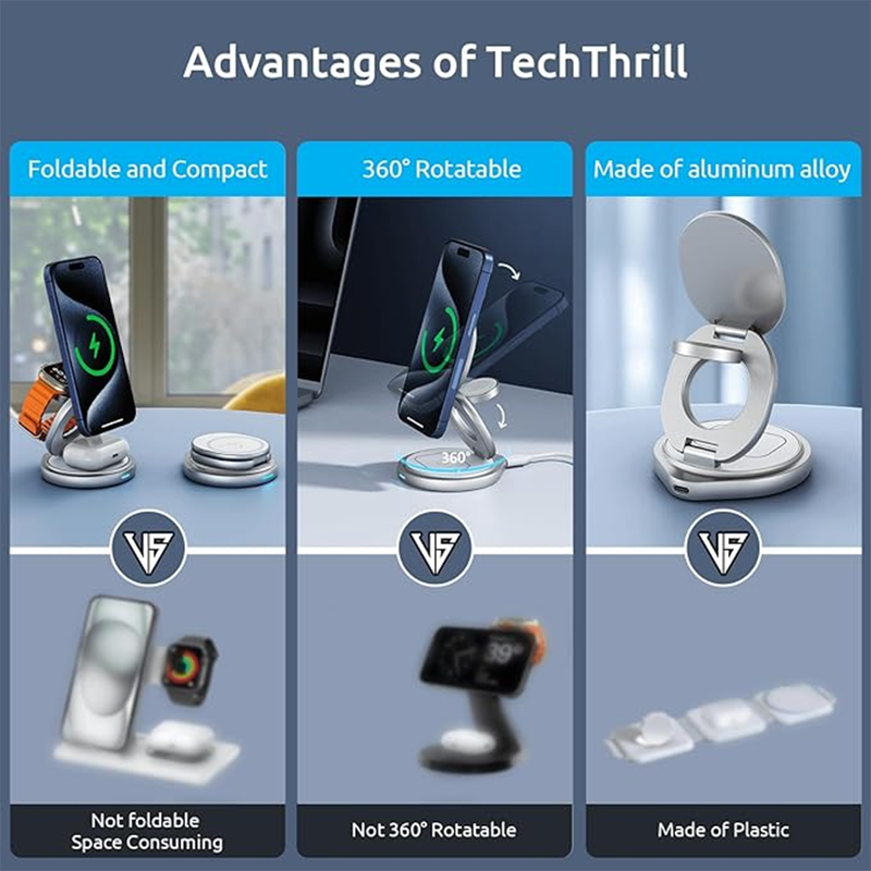 • 【Foldable Magsafe Travel Charger】 TechThrill travel charging station is specially designed for Apple devices. Compact size, weighing only 0.47 pounds. And we will also give you a beautiful storage box as a gift. All charging devices can be perfectly positioned when traveling. Say goodbye to messy charging cables. The Mag-Safe charger can hold your iphone horizontally and vertically, or in any directions. The anti-slip design on the bottom makes charging safer.