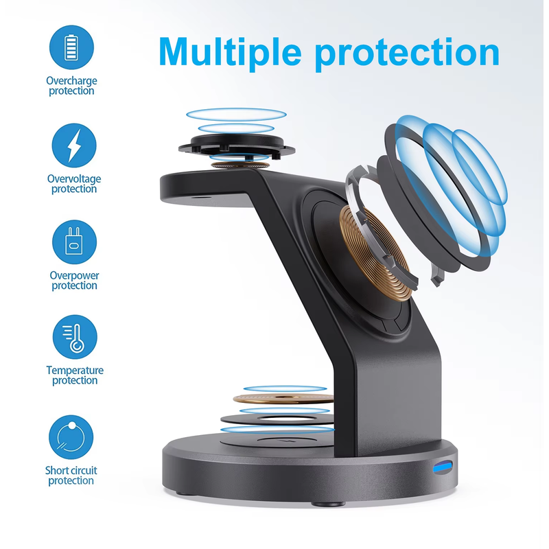 This Apple charging station uses a professional magnetic isolation sheet with no radiation to protect you and your family. The built-in intelligent chipset provides over-current, over-voltage, and over-temperature protection for charging. When the temperature is too high, charging will be automatically interrupted to avoid damage to the battery.