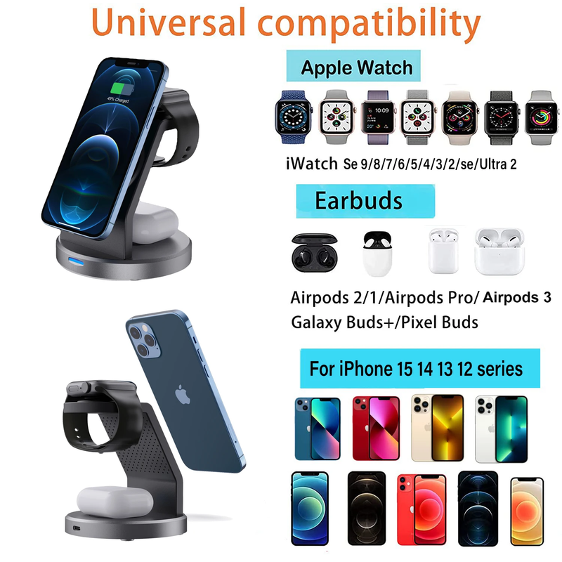 Our 3 in 1 iPhone charging station provides 3 charging points, say goodbye to cluttered desktops, and charge your iPhone, iWatch, and AirPods at the same time. Fast Magnetic Wireless Charger Station compatible with iPhone 15/15 Pro/15 Pro Max/14 Pro Max/14 Pro/14/14 Plus/13 Pro Max/13 Pro/13/13/13 Mini/12/12 Pro/12 Mini/12 Pro Max, iWatch Ultra/8/7/SE/6/5/4/ 3/2 and AirPods 3/ 2 Pro 2/Pro and iPhone models