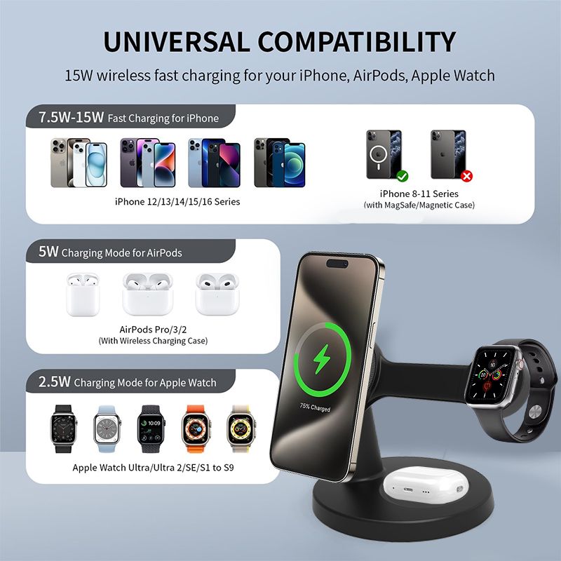 3 In 1 Magnetic Wireless Charger Stand For Magsafe iPhone 16 15 14 13 Pro Max Apple Watch 9 8 AirPods Pro Fast Charging Station