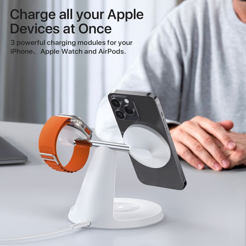• Your All-in-One Power Solution:This charging station for apple devices could be your ultimate solution for all your charging gears. It is a mag-safe charging stand for iPhone, has a magnetic module for wireless Apple Watch charger, and a non-magnetic wireless charger for AirPods with wireless charging case. Let it be a part of your desk organizer and table top idea.