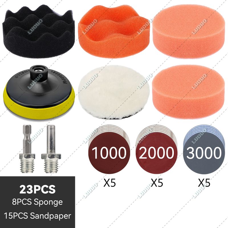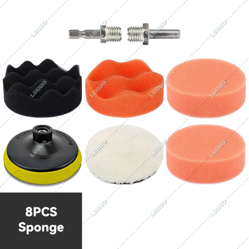 8PCS Sponge Polishing Kit, Flat SpongeX2, Wavy SpongeX2, Wool PadX1, Backing PadX1, Drill AdapterX2