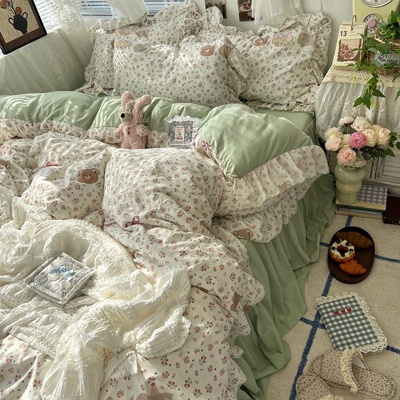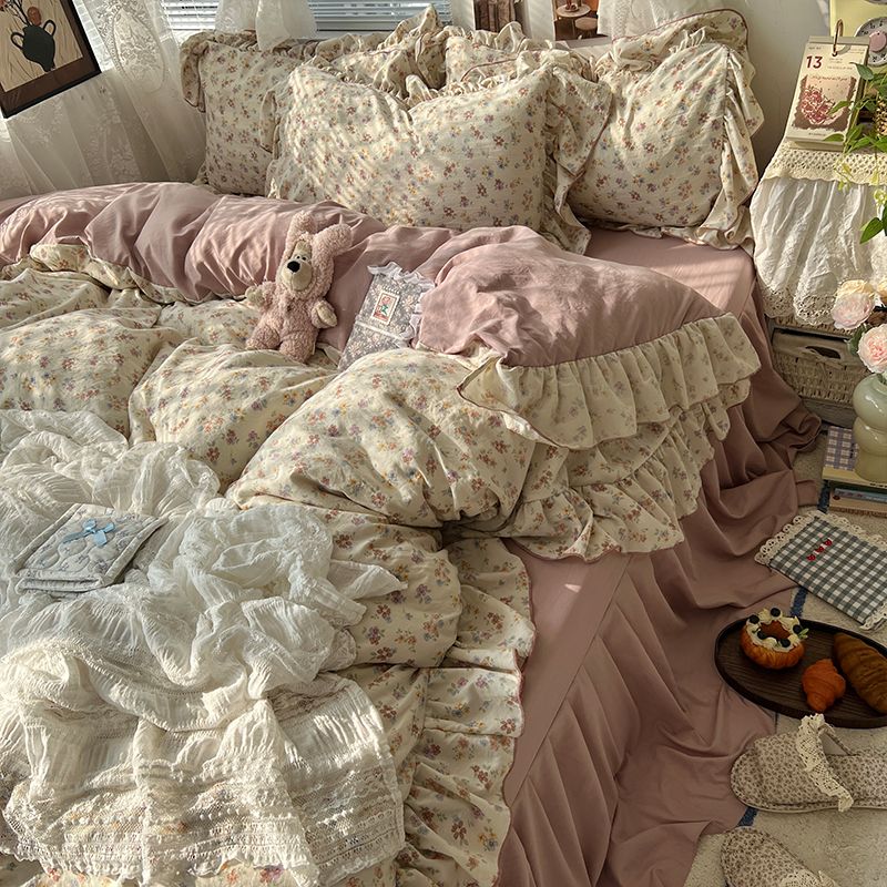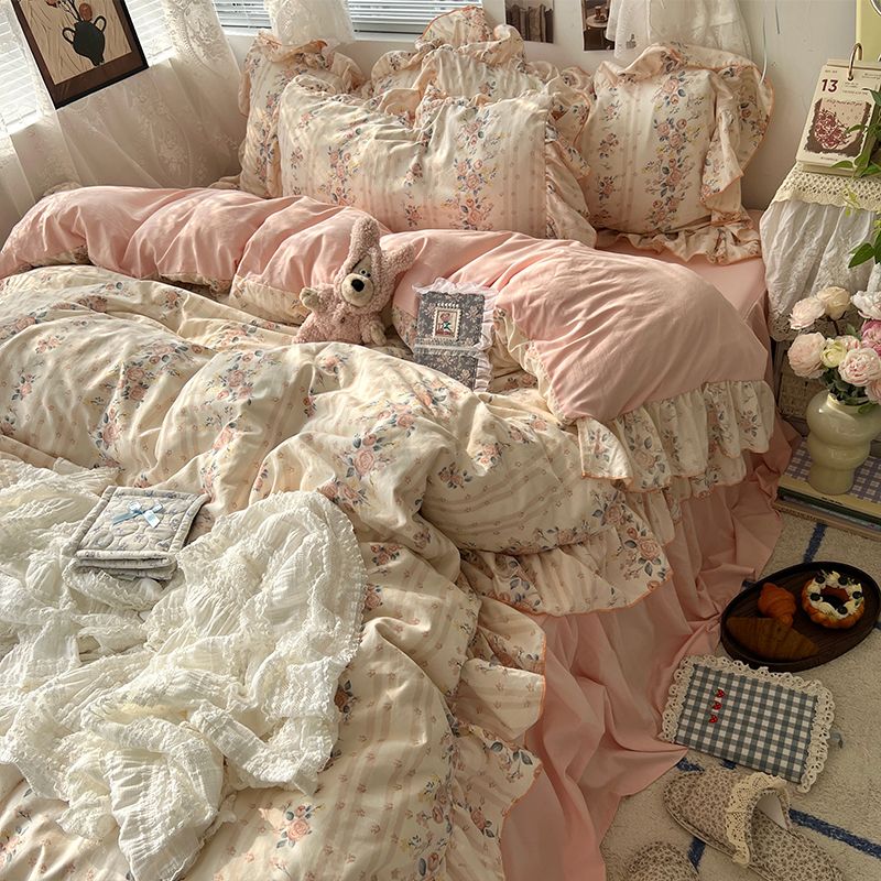 3/4Pcs Korean Princess Style Floral Ruffles Bedding Set Skin-friendly Soft Duvet Cover Set Bed Sheet Or Bed Skirt Pillowcases