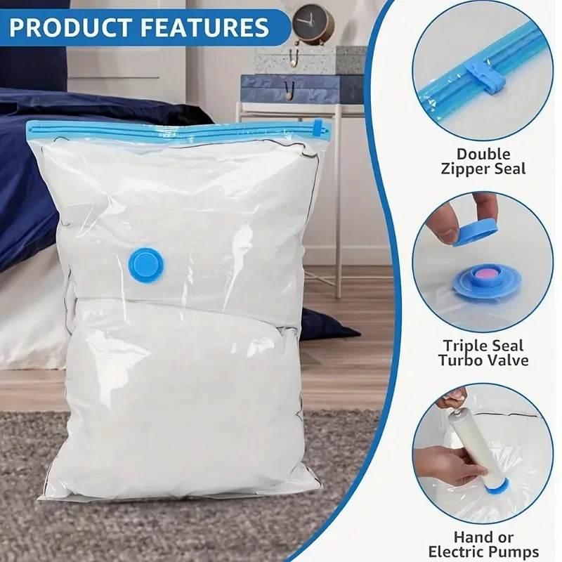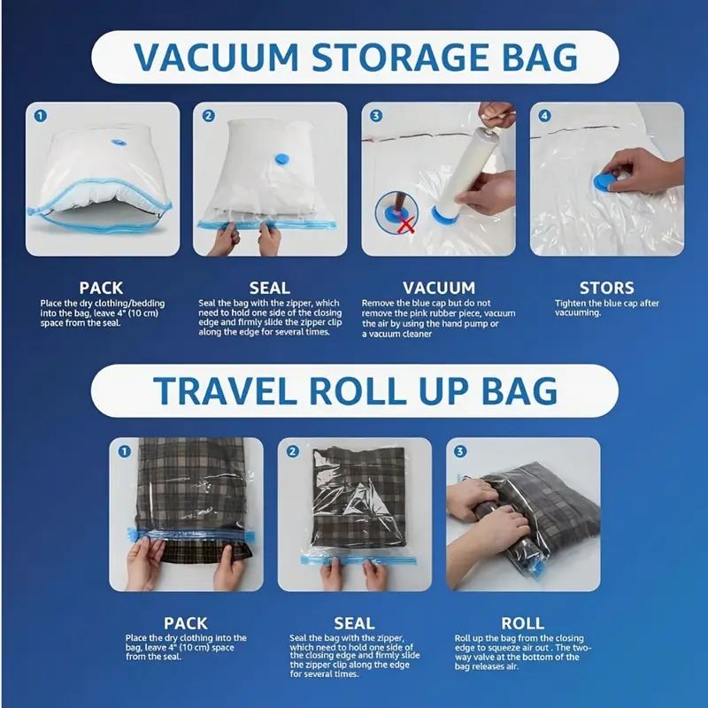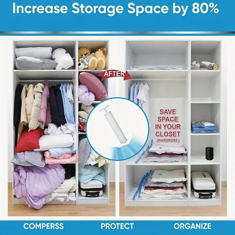 3/7/9-Piece Vacuum Compression Bags in S/M/L sizes. Wholesale storage bags for seasonal clothes, quilts & travel. Home organizer