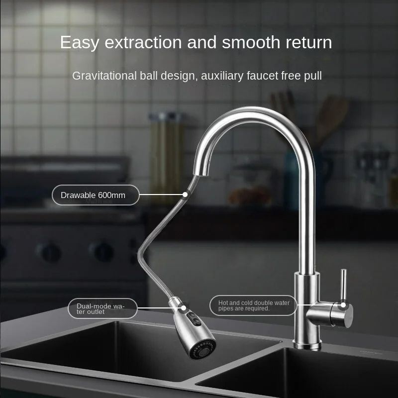 This is a lightweight and uniquely designed kitchen sink pull-up hot and cold faucet. The bent pipe outlet pipe is wrapped in high-quality 304 stainless steel, and the inner pipe and outlet nozzle are made of high-quality ABS plastic. The cold and hot switch uses a ceramic valve core, which is durable!
