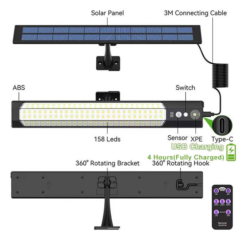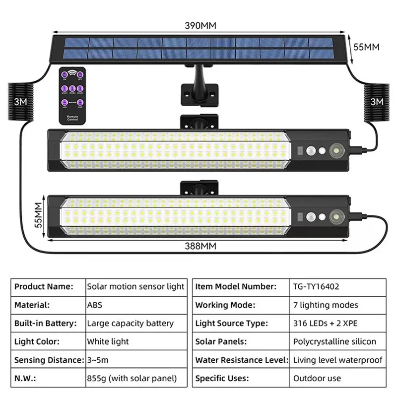 316/158 LED Solar Light Bar Outdoor 7 Mode Motion Sensor Separate 1/2Head Lamp with 3 Meter Wire Street Wall Lights Garage Yard