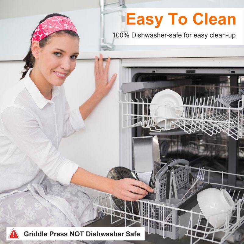 • *Easy To Clean*:Most tools in this grill cooking kit are dishwasher safe,ensuring that them stay in top condition with minimal effort.The stainless steel and cast iron components can be wiped down with a simple cleaning brush. Note:The grill press is NOT Dishwasher safe.