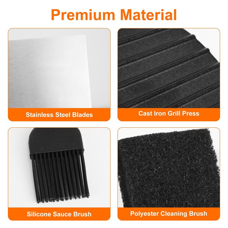 • *Premium Top Grill*:Premium materials(Stainless Steel,Cast Iron,Anti-scalding Plastic Handles etc.),these flat top grill accessories are designed for long-lasting performance. They can endure high temperatures and regular use with ease. The griddle press and spatulas facilitate effortless flipping,stirring,and serving,making them the perfect addition to your cooking toolkit!