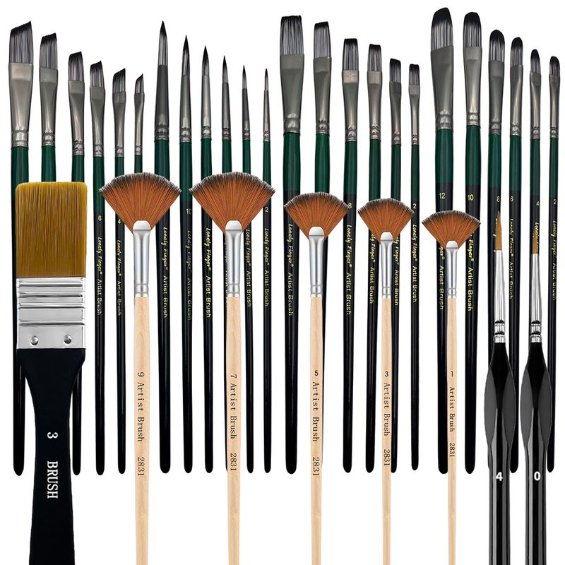 32 Pieces Paint Brushes - Paint brushes for acrylic painting set includes 32 art paint brushes in 7 series. Whether it's for extreme details or large areas, these round, filbert paint brush, fan paint brush and flat brushes work well. The acrylic paint brushes include flat (2/4/6/8/10/12), Filbert (2/4/6/8/10/12), fan (1/3/5/7/9), round (2/4/6/8/10/12), angle round (2/4/6/8/10/12), detail (0/4), and large flat brush (2").