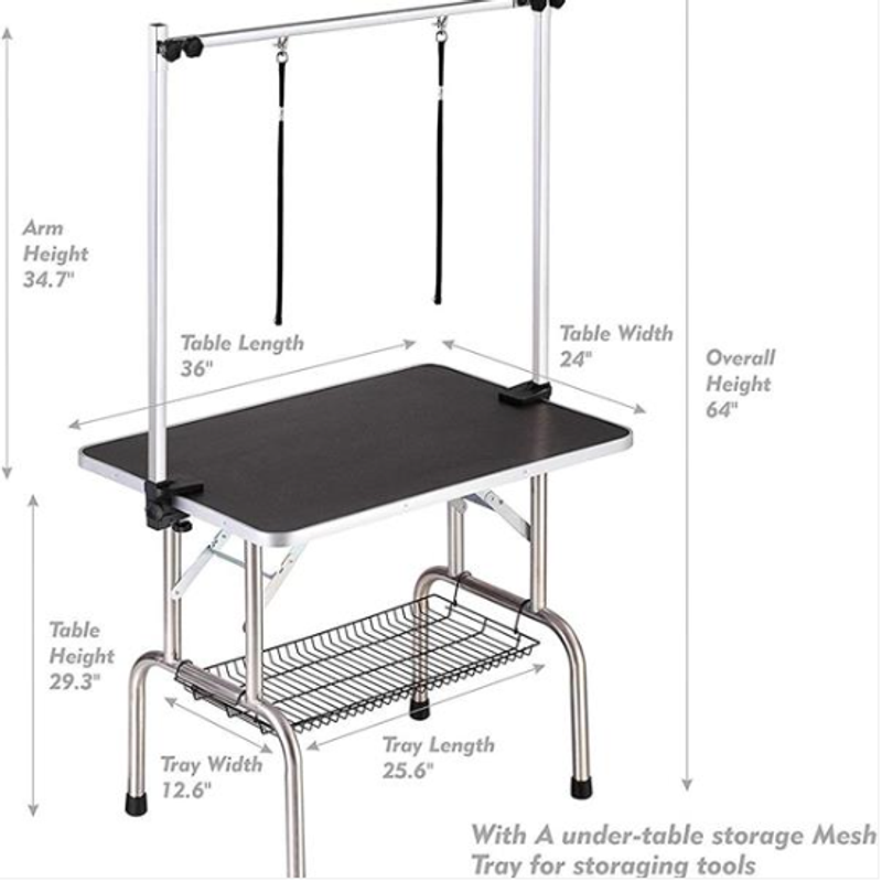 Comes with a clip-on adjustable grooming arm and safety nylon ring for securing the dog for grooming. Adjustable Arms: The height of the arms can be adjusted to suit the needs of different dogs.