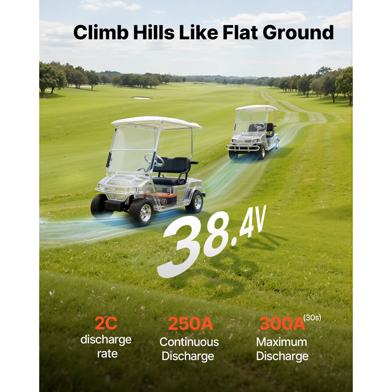 Effortless Hill Climbing: The 38.4V LiFePO4 golf cart battery delivers a 2C discharge rate, providing 250A continuous discharge and 300A peak current(30s). Climb hills effortlessly, take your golf game to the next level with reliable performance