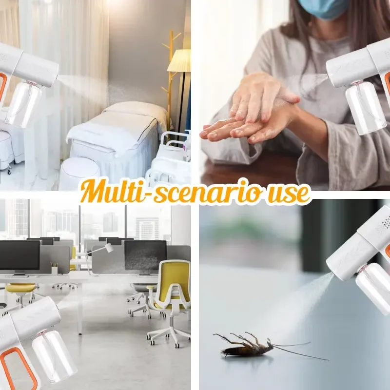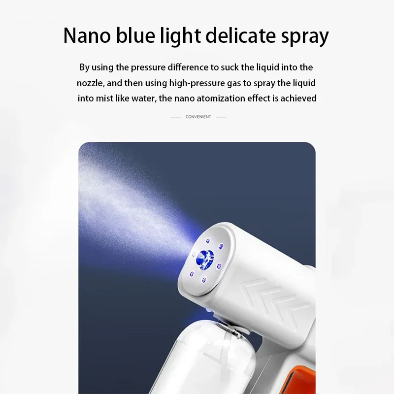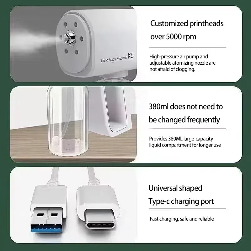 USB rechargeable: 2000mAh battery, 380ml large-capacity water bottle, ultra-fine atomized particles. Works with most liquids and supports everyday use. Also, this sprayer is very portable and can be used wherever it needs to be used.