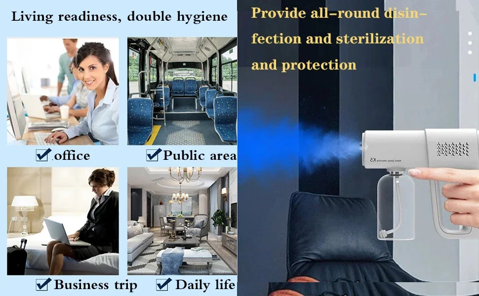 Safety and harmless: You can easily clean the whole room in a short time. More effective than hand wiping, pump spraying or mopping. The spraying range is very wide, and the spray gun can be sprayed directly on the surface of the human body, fabric, household appliances and other objects.