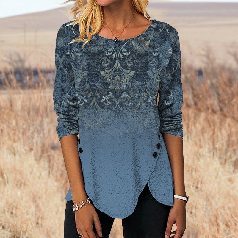 3D Digital Retro Printed Button Irregular Hem Round Neck Long Sleeve INKTX055 XL