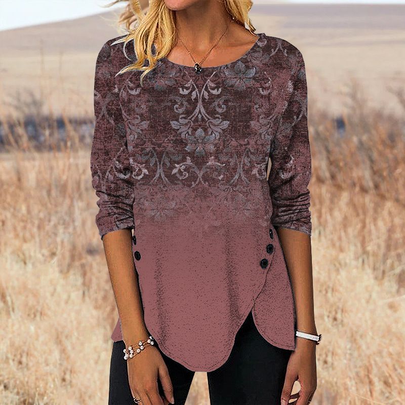 3D Digital Retro Printed Button Irregular Hem Round Neck Long Sleeve INKTX056 XL