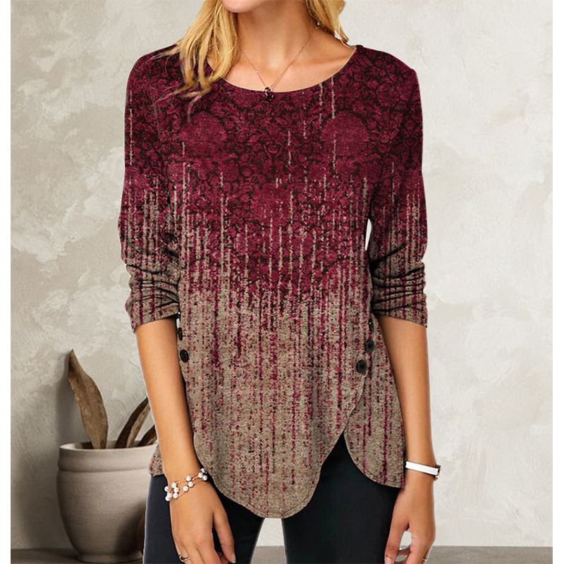 3D Digital Retro Printed Button Irregular Hem Round Neck Long Sleeve INKTX071 XL