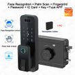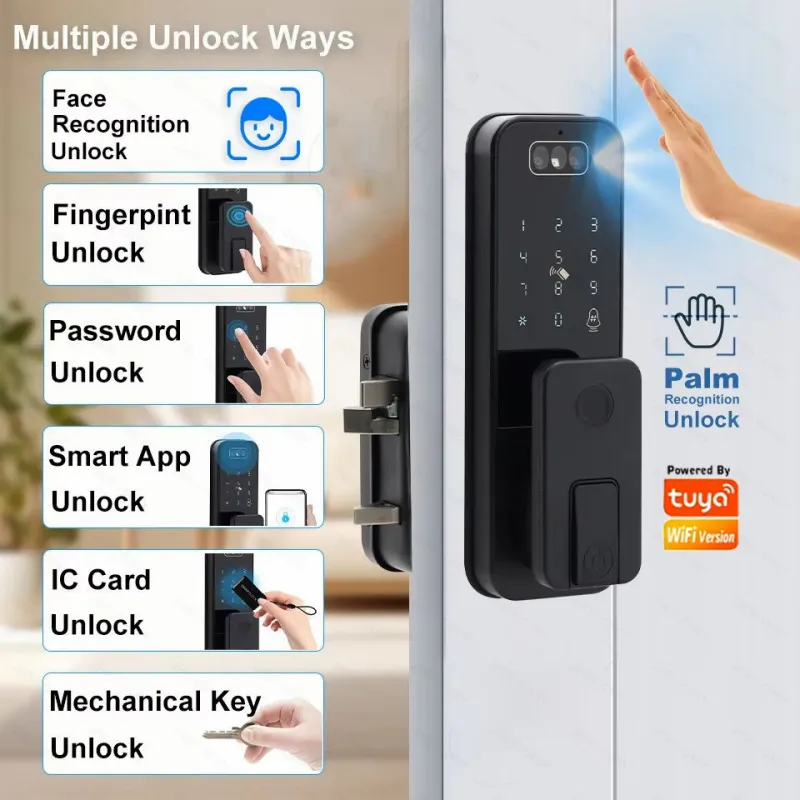 Offers versatile entry options including palm recognition, facial scan, Tuya APP, fingerprint, Passcode, RFID cards, and a physical emergency key to suit all users and situations.