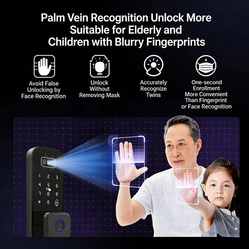 The smart door lock supports Palm Vein recognition/ Face recognition/ fingerprint/password/IC card/mechanical key/App multiple unlocking methods.