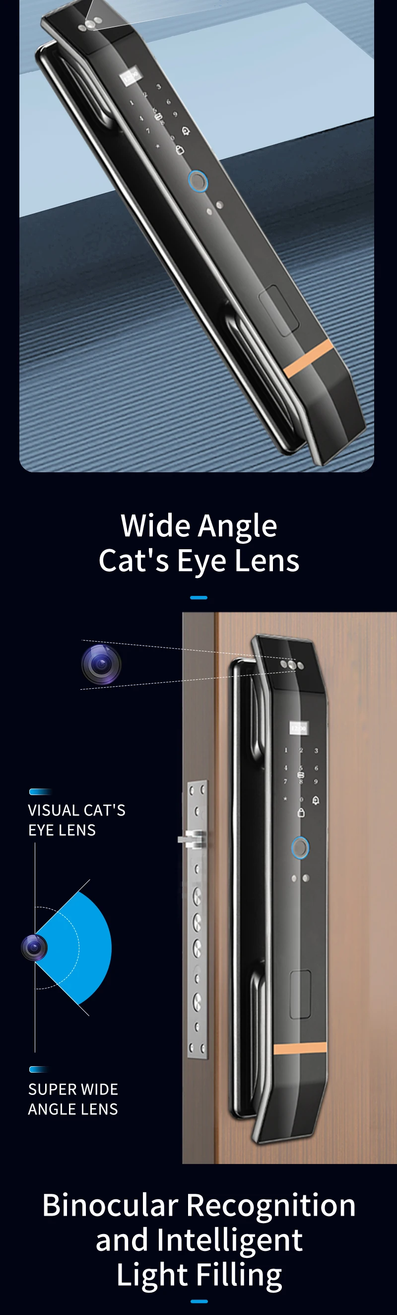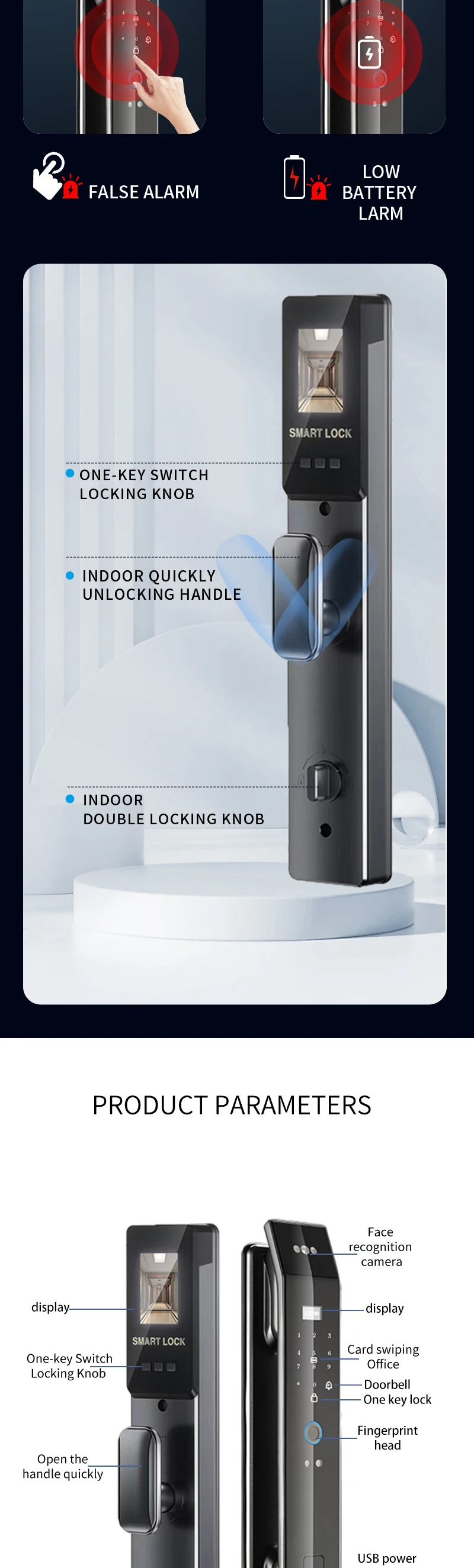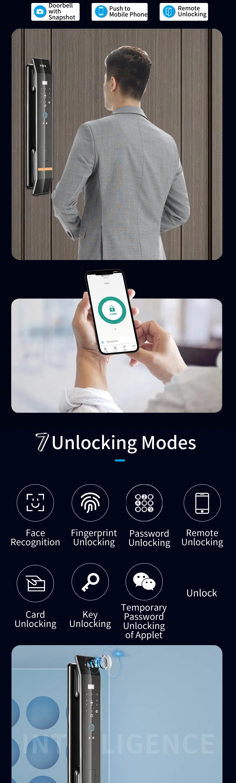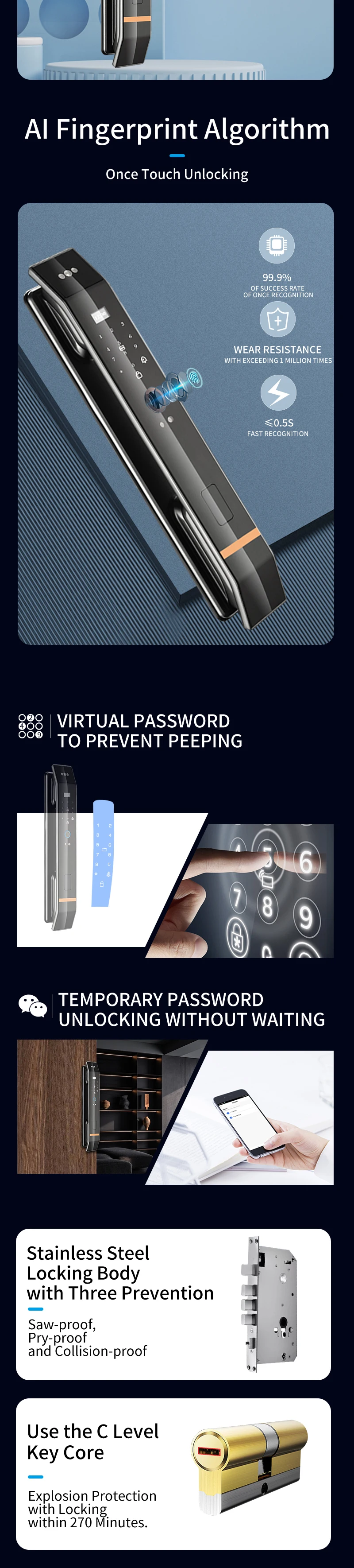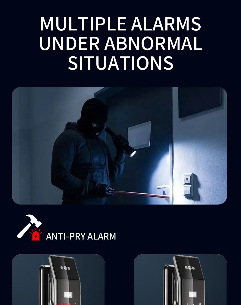 With rear doorbell, anti-pry alarm,one-key quick unlock and automatic lock function, support card and fingerprint encryption to prevent copying, support system card swipe upgrade program