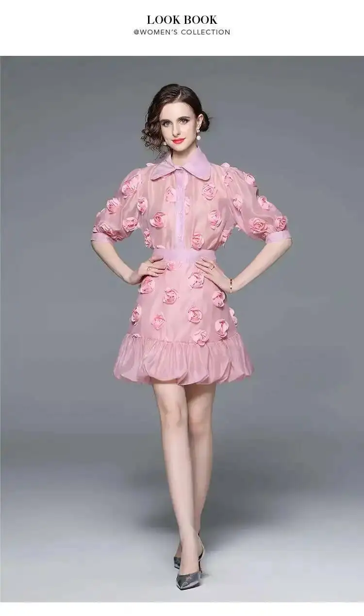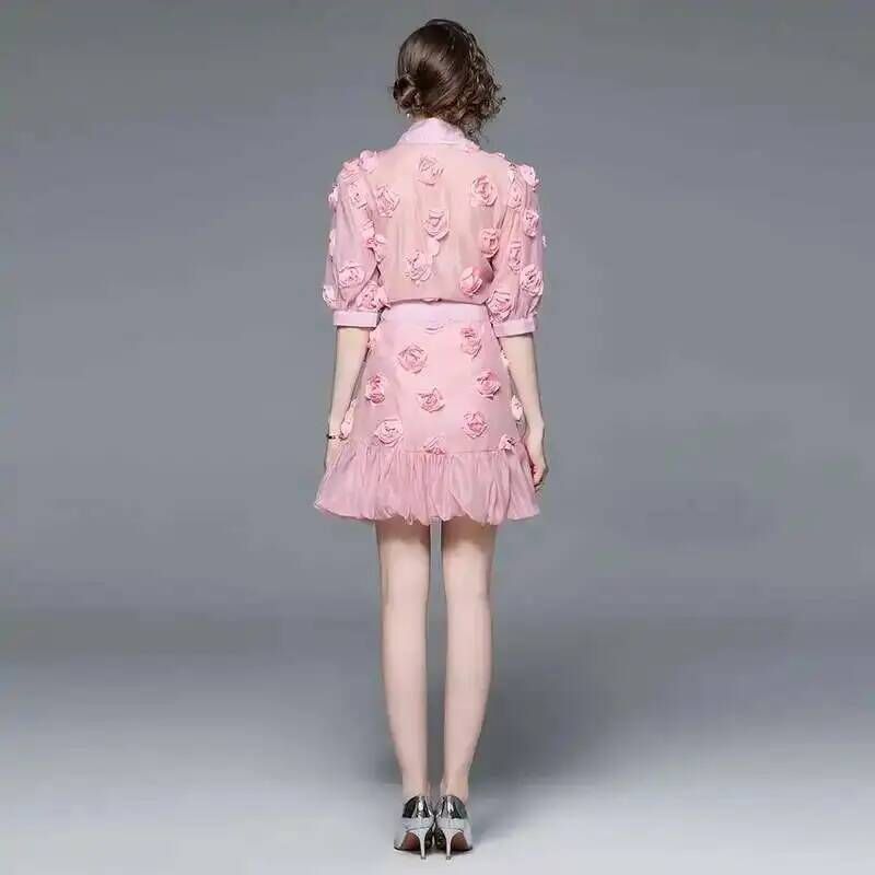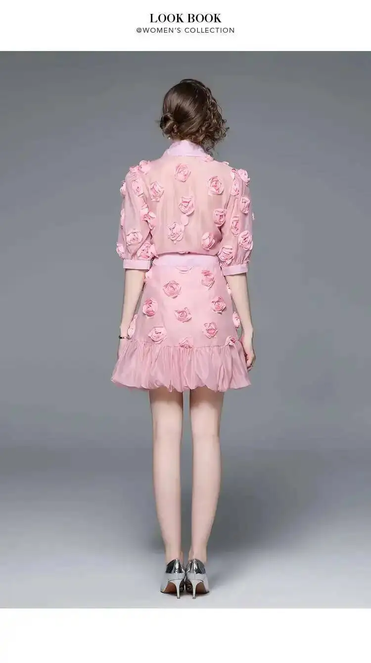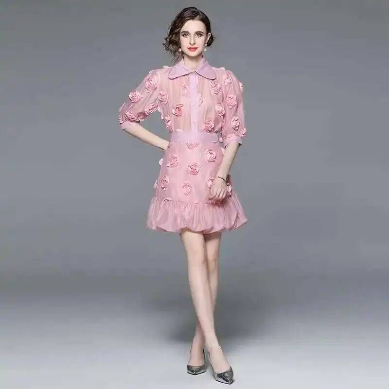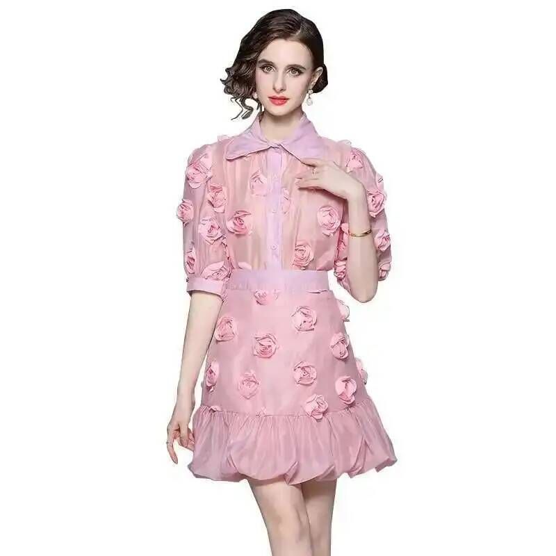 3D Flower Embroidery Two Piece Set Women Dress Suits 2023 Summer Floral Shirt + A Line Pleated Mini Short Skirts Sets