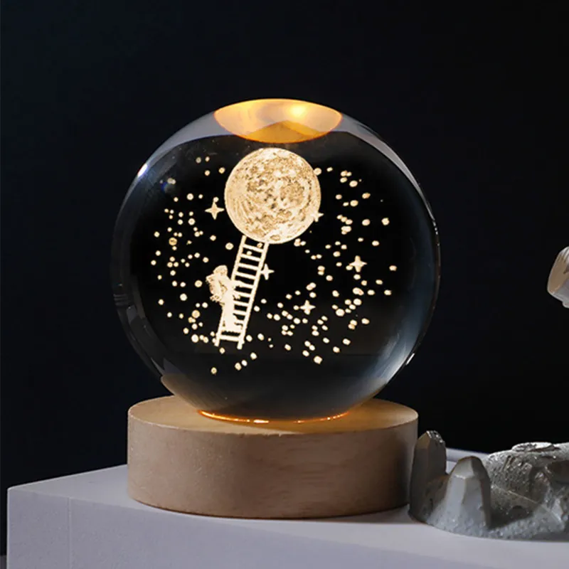 1.Exquisite 3D Laser Engraved Crystal Ball: Our crystal ball night light comes in four different styles, featuring advanced 3D laser engraving techniques.  The 3D crystal ball LED night light showcases various themes like the solar system, ensuring that the crystal maintains its brilliance even after long-term use.  Perfectly crafted, these 3D crystal ball decorations create a romantic ambiance for both children and adults.  The LED-lit wooden base adds a warm and bright glow, making it a stunning centerpiece in any room.
