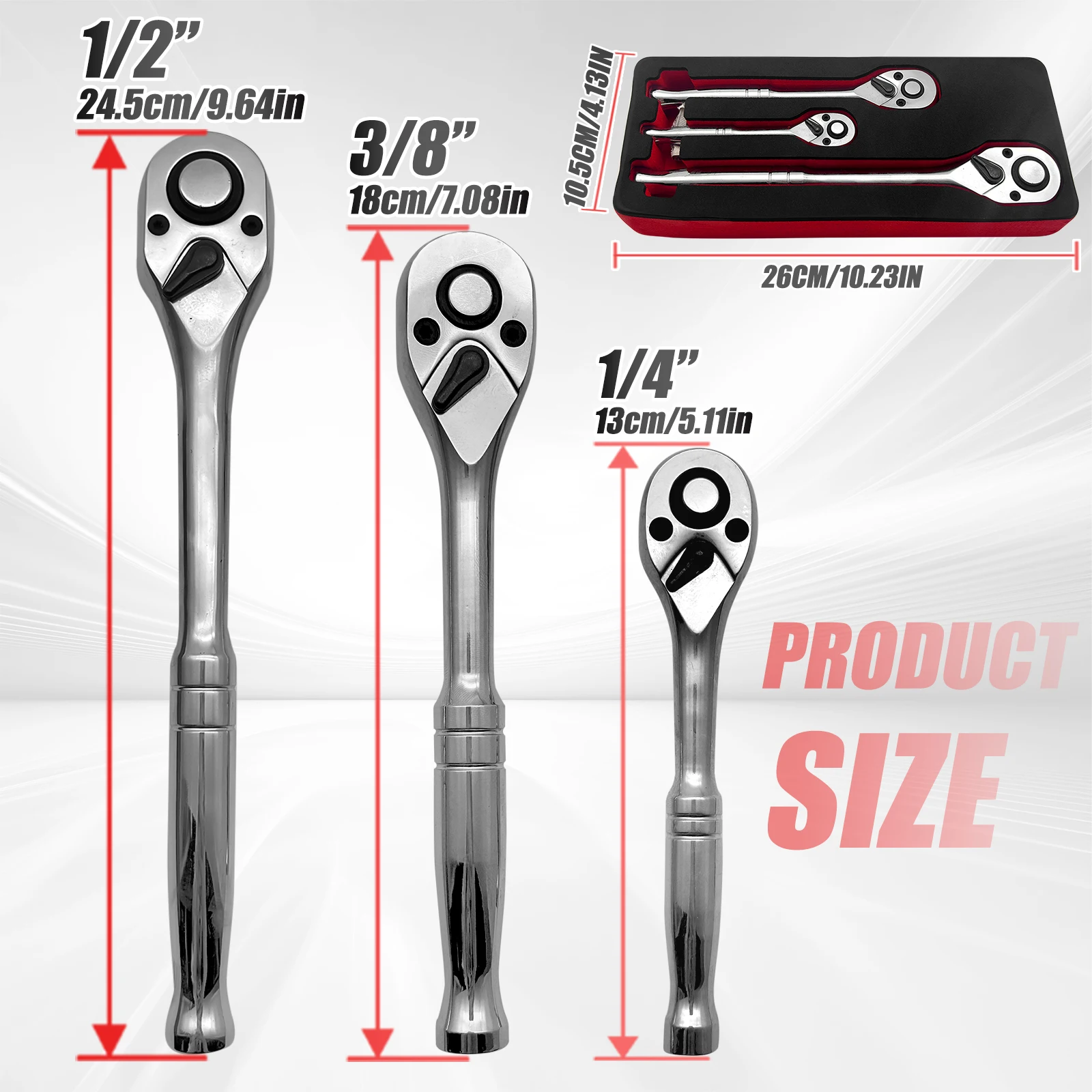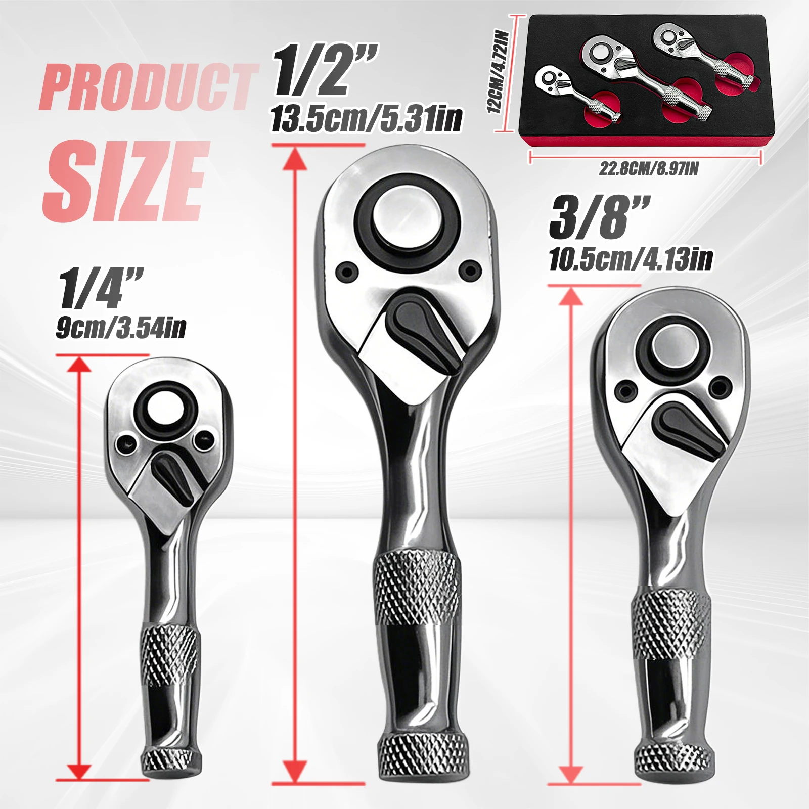【Compact & Powerful Ratchet Wrench Set】: Upgrade your toolbox with this 3-piece ratchet wrench set, designed for tight spaces and precise work. This ratchet set includes 1/4", 3/8", and 1/2" drive ratchets, with compact lengths of 130mm, 180mm, and 245mm, making them perfect for automotive repairs, home maintenance, and professional use.