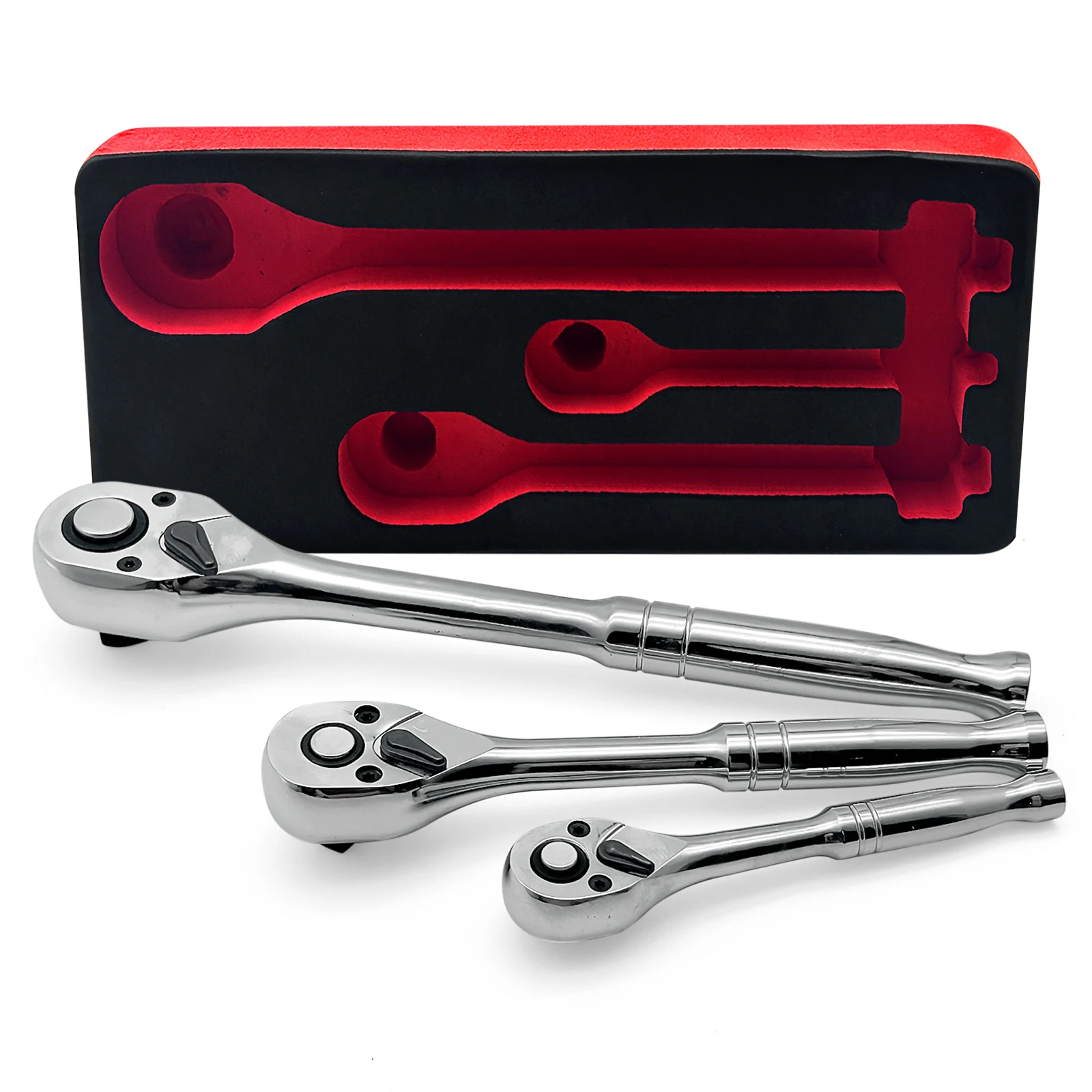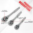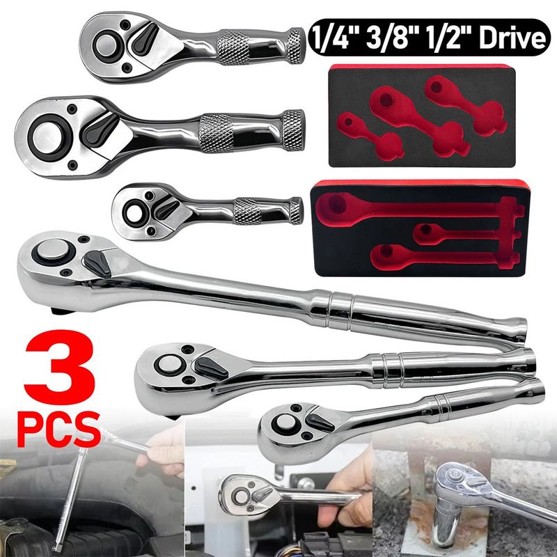 3Pcs 1/4" 3/8" 1/2" Long Ratchet Socket Wrench Quick Release Reversible Set